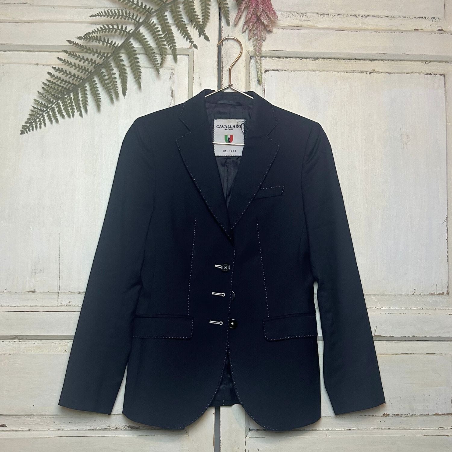Een prachtige donkerblauwe blazer van Cavallaro Napoli. De blazer heeft mooie witte stiksel details en drie knopen. Draag de blazer met een jeans voor een casual look of met een pantalon voor een chique look.
