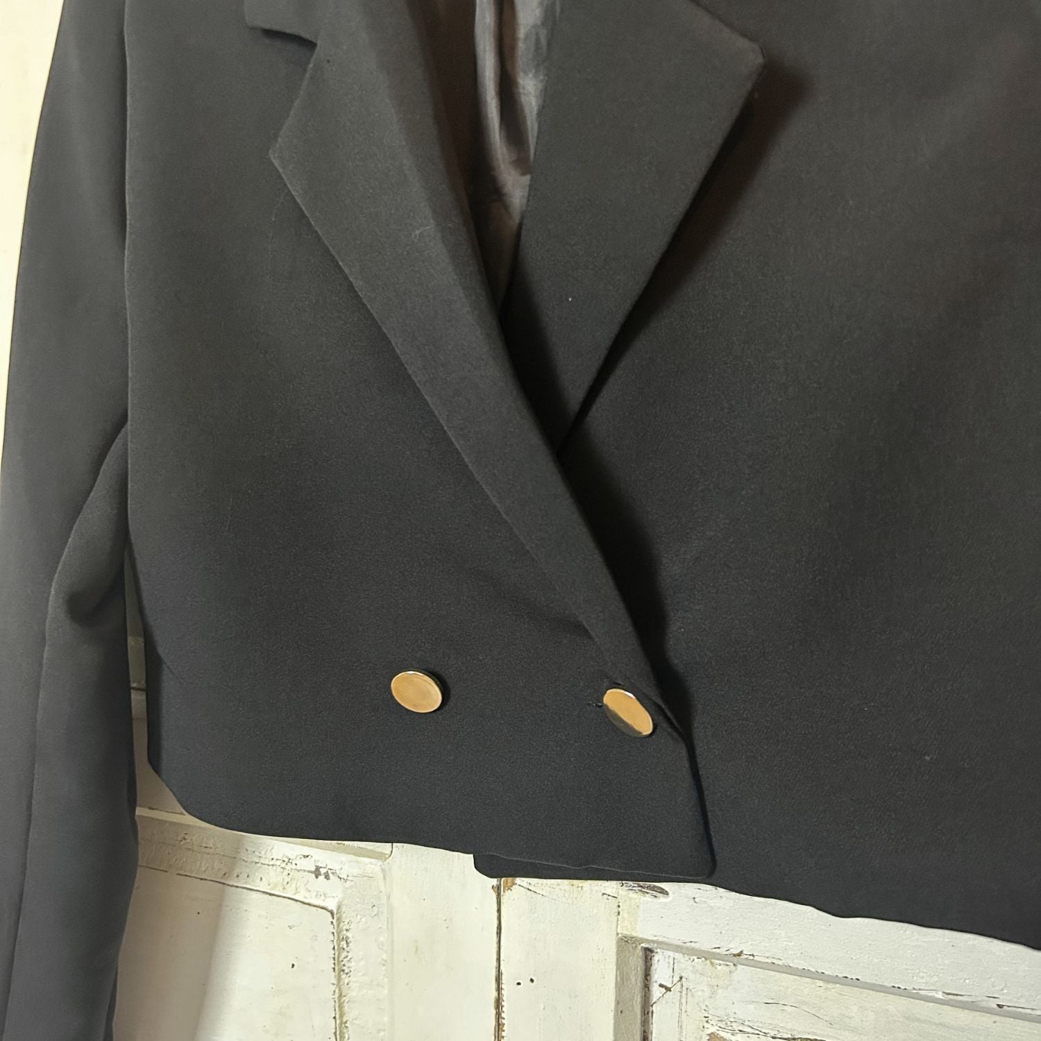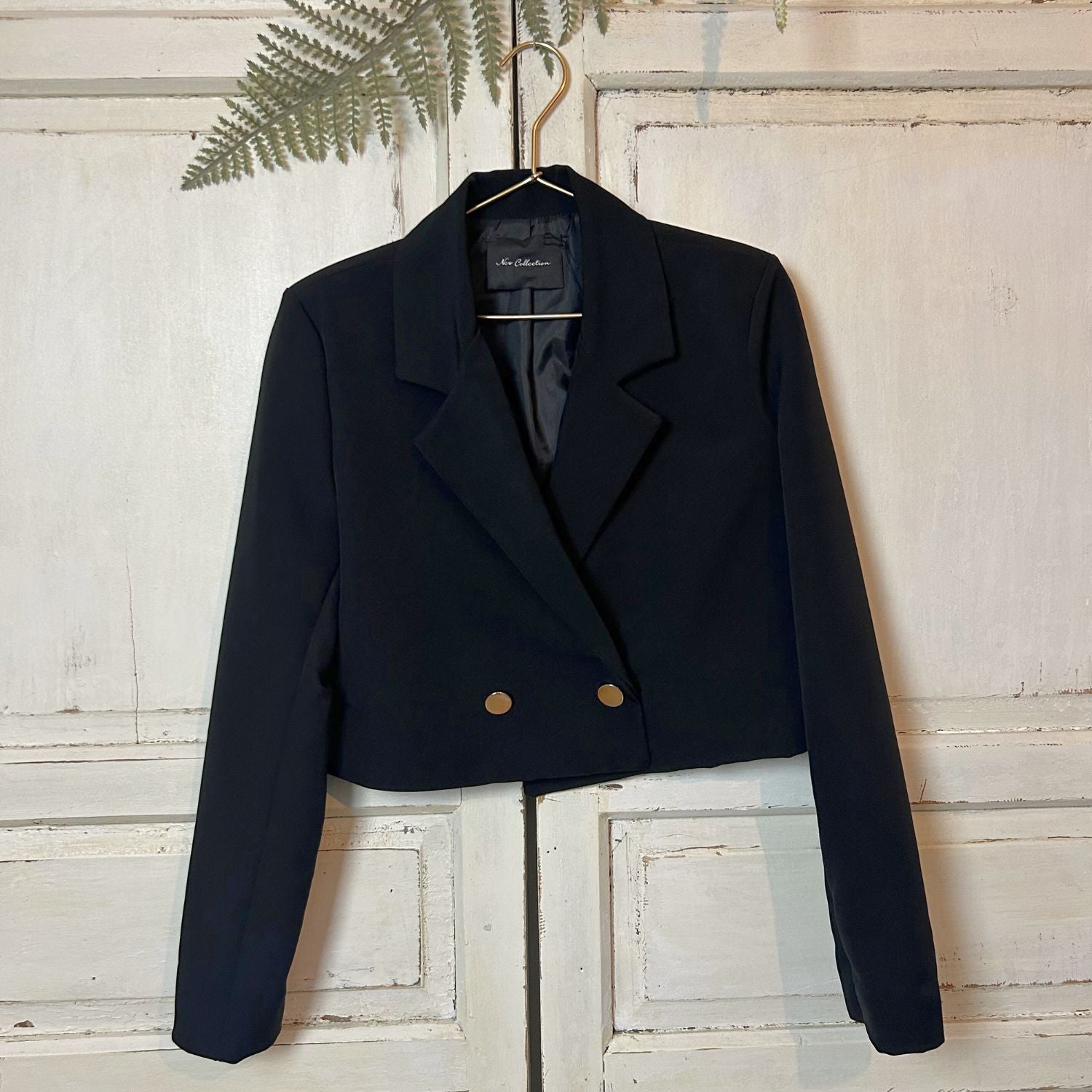 Een prachtige korte zwarte blazer. De blazer heeft twee gouden knopen.