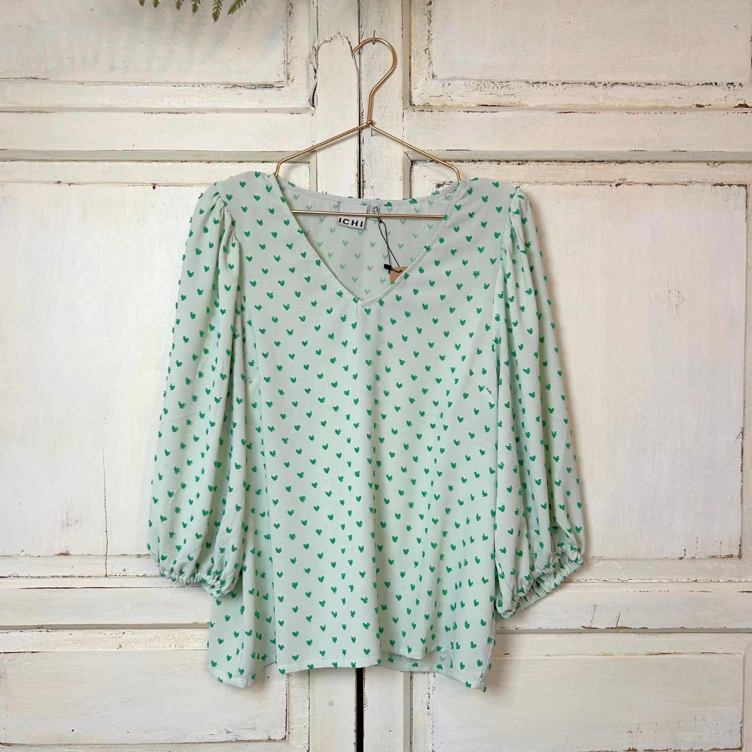 Schattige licht groene blouse met groene hartjes en ballon mouwen. De blouse heeft een V-hals en is super leuk te dragen op een witte broek of jeans. Het is een ruimvallend model, maar valt wel op maat.