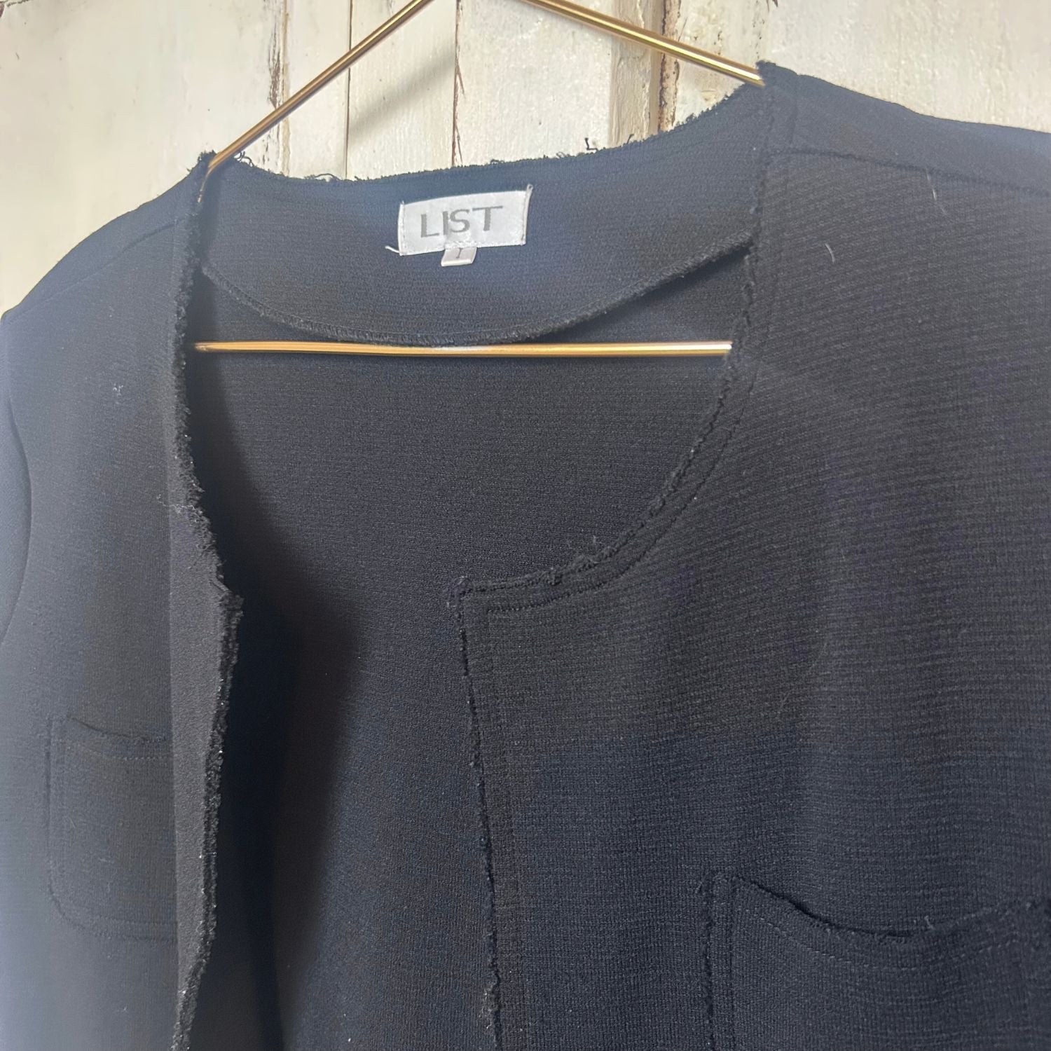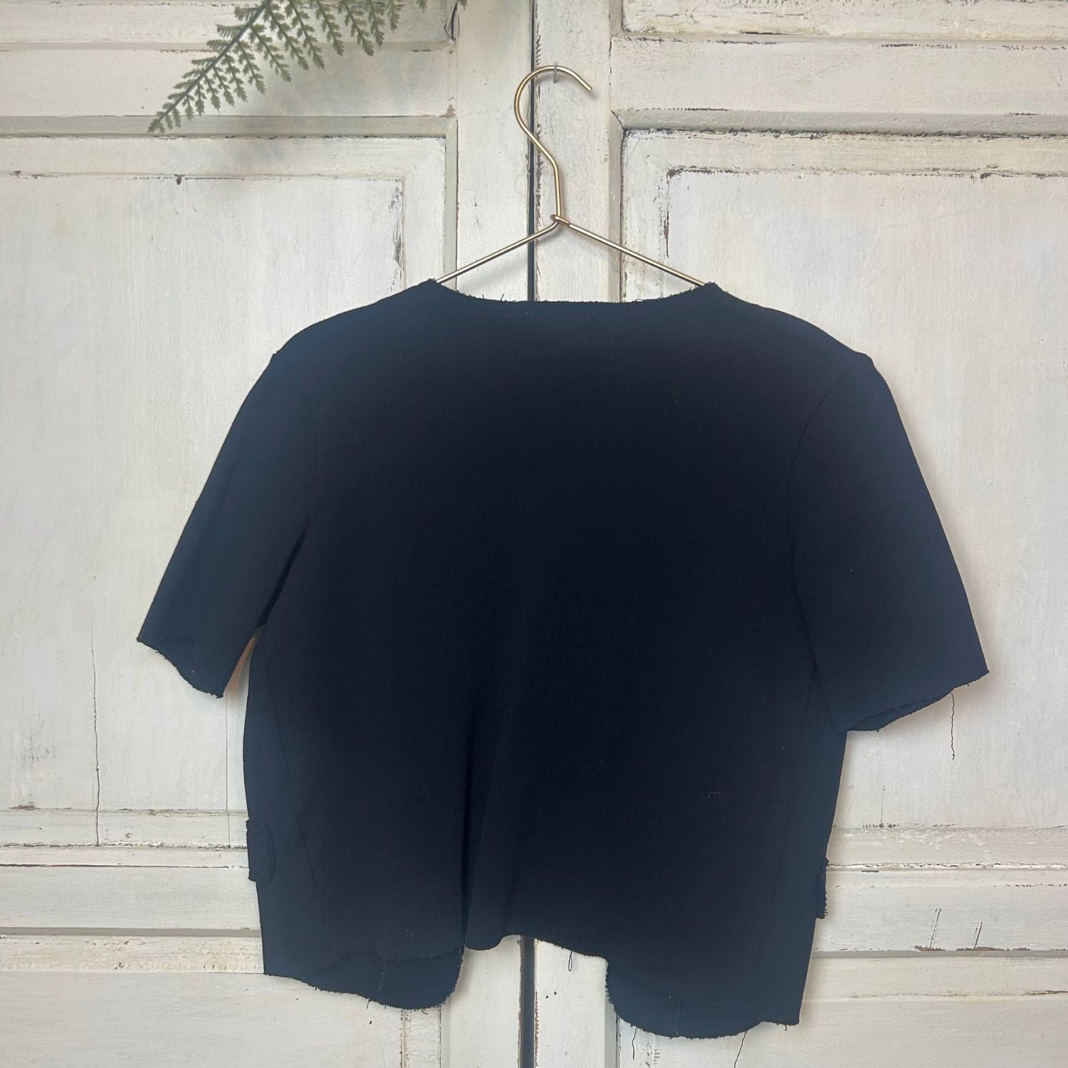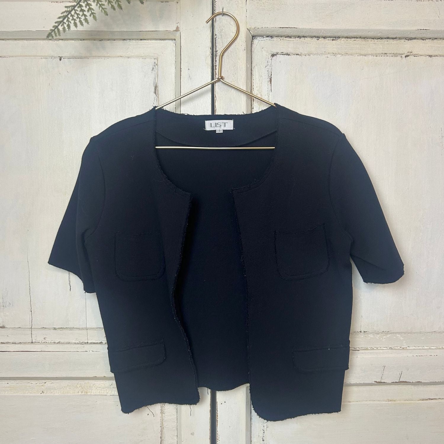 Leuke korte bollero met korte mouw en nepzakjes op het voorpand. Leuk om ergens overheen te dragen. Kan zowel op een rok of broek gedragen worden.