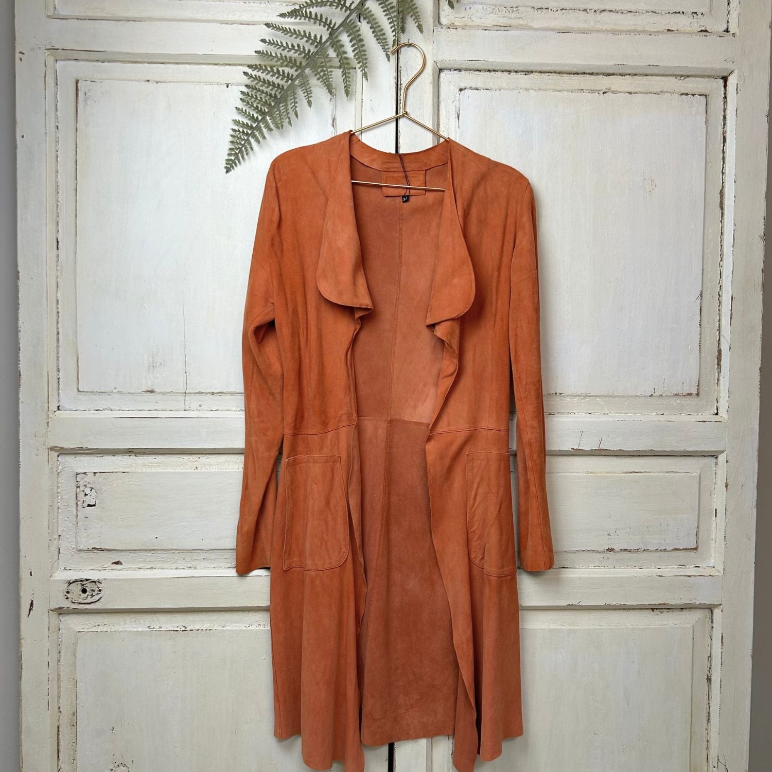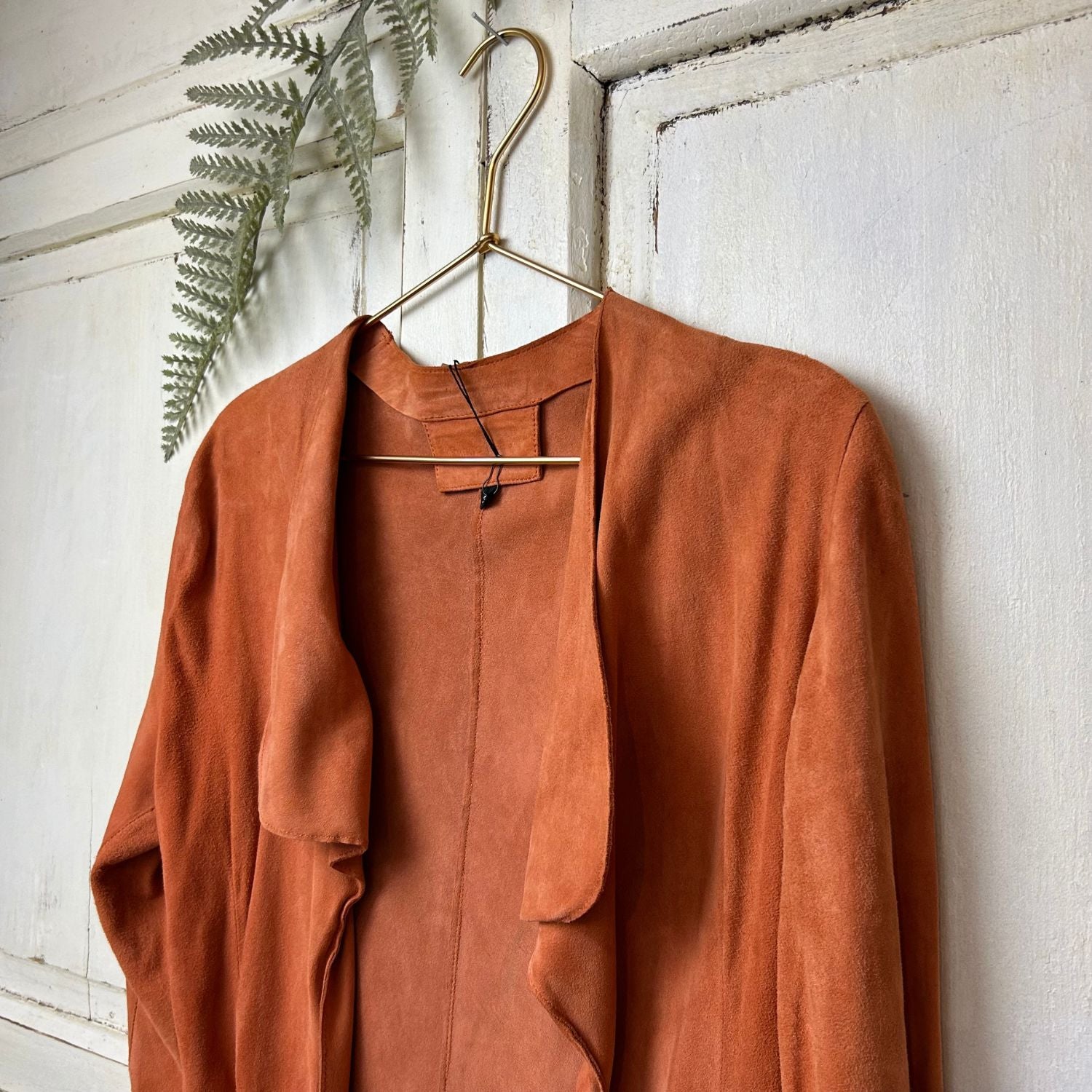 Een stoere oranje suedine jas. De jas heeft 2 zakken.