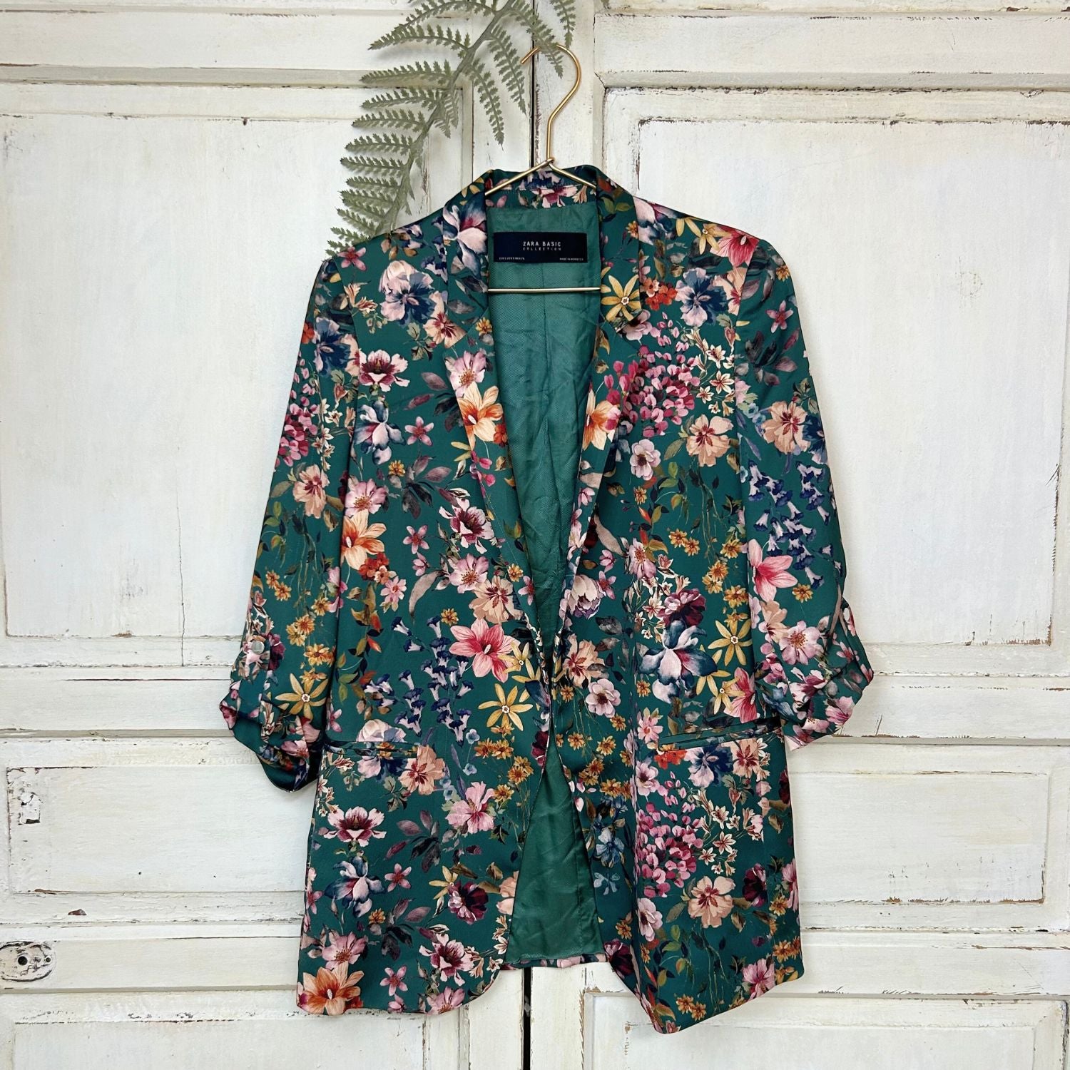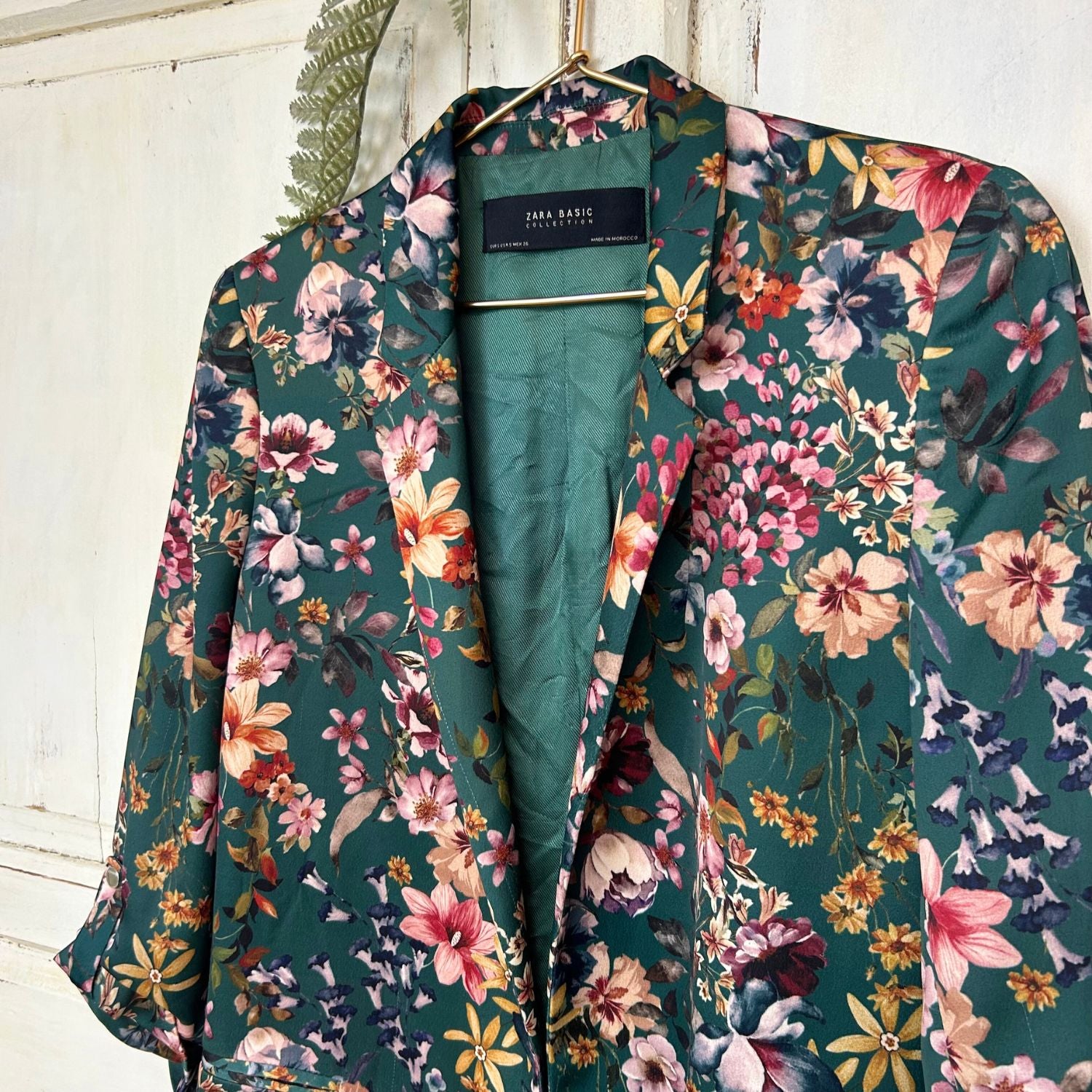 Hoe tof is vrolijke groene blazer met bloemen? Draag hem op een blauwe of grijze jeans.