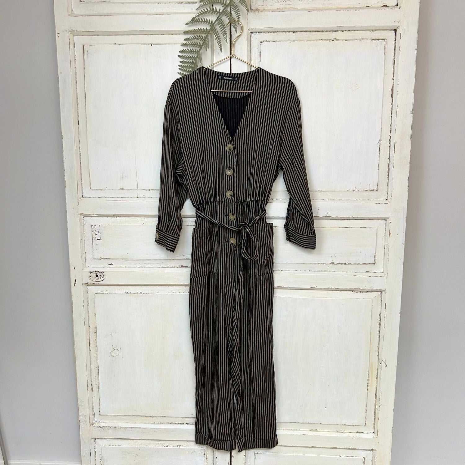 Een prachtige jumpsuit met bruin en zwarte strepen. De jumpsuit heeft knopen, 2 zakken en een ceintuur om de taille.