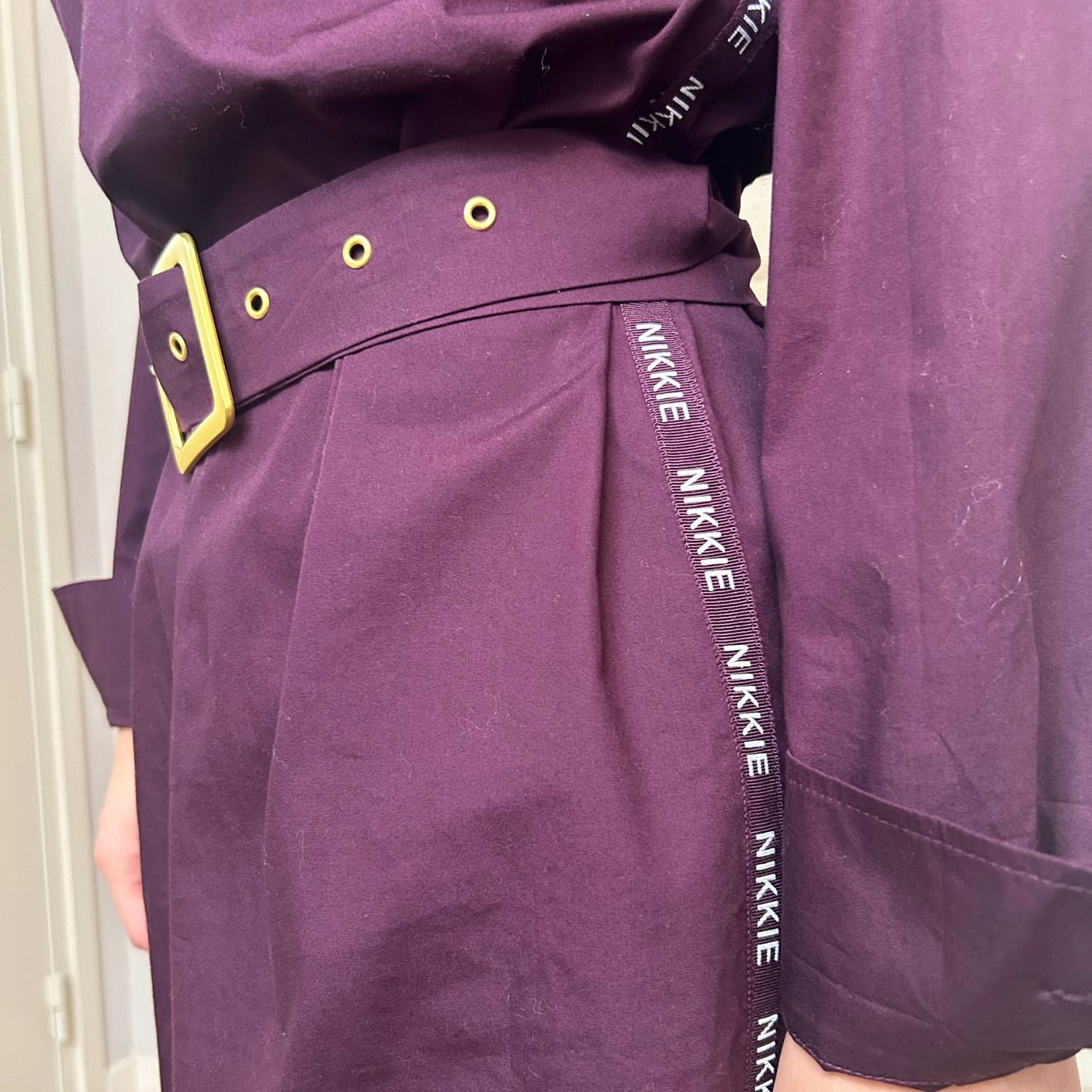 Hele hippe blouse jurk in een prachtige paarse kleur. Zowel in de zomer als in de winter te dragen. De jurk is afgewerkt met een witte Nikkie bies langs de V-hals en aan de zijkant van de blouse. Heel stoer met de ceintuur met goudkleurige gesp om het middel. Draag de jurk met een stoer laarsje en je bent helemaal klaar!