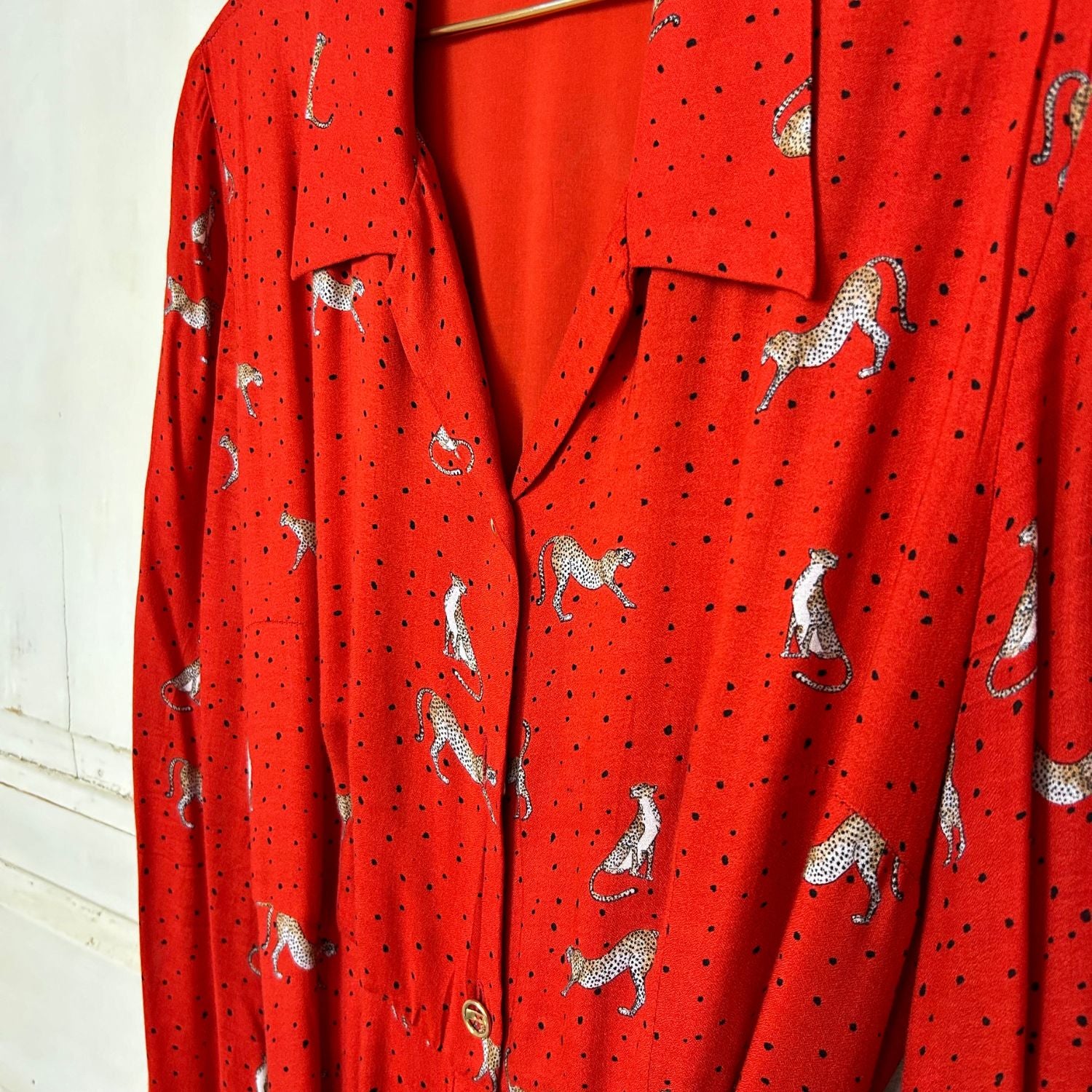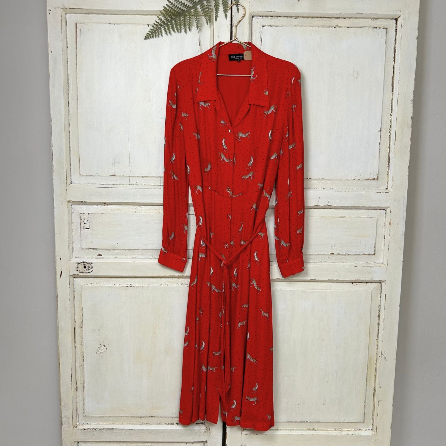 Rode jurk met de bekende tijger erop. Deze jurk is van een fijne stof gemaakt en heeft een strikkoord om de taille. Ook heel leuk om een zwarte gebreide trui over heen te dragen.