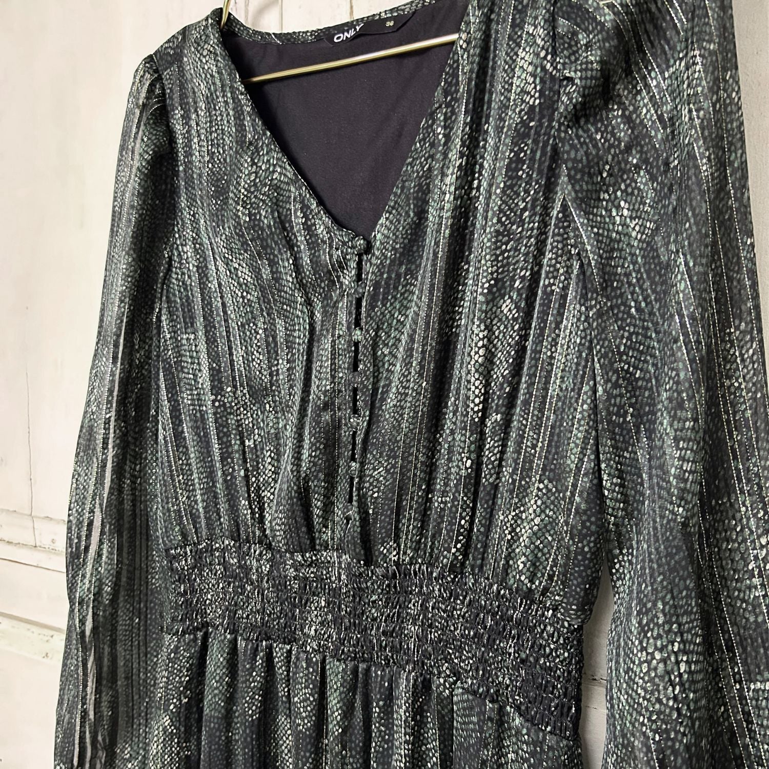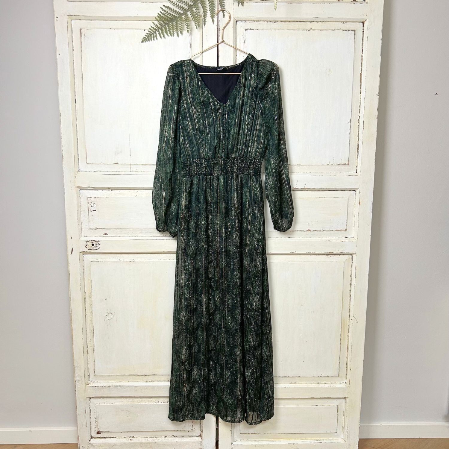 Mooi lange feestelijke groene jurk met een prachtig goud accent. De mouwen zijn transparant.