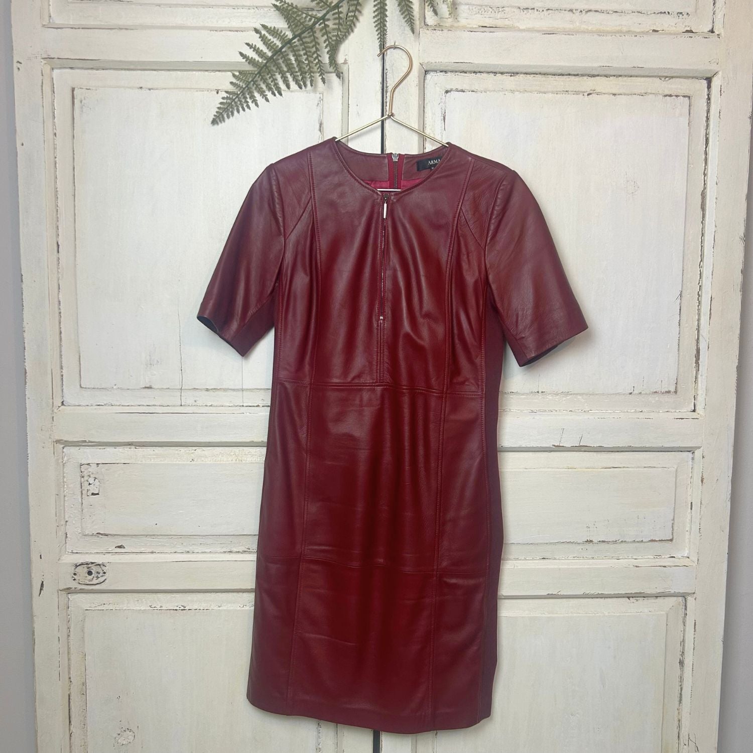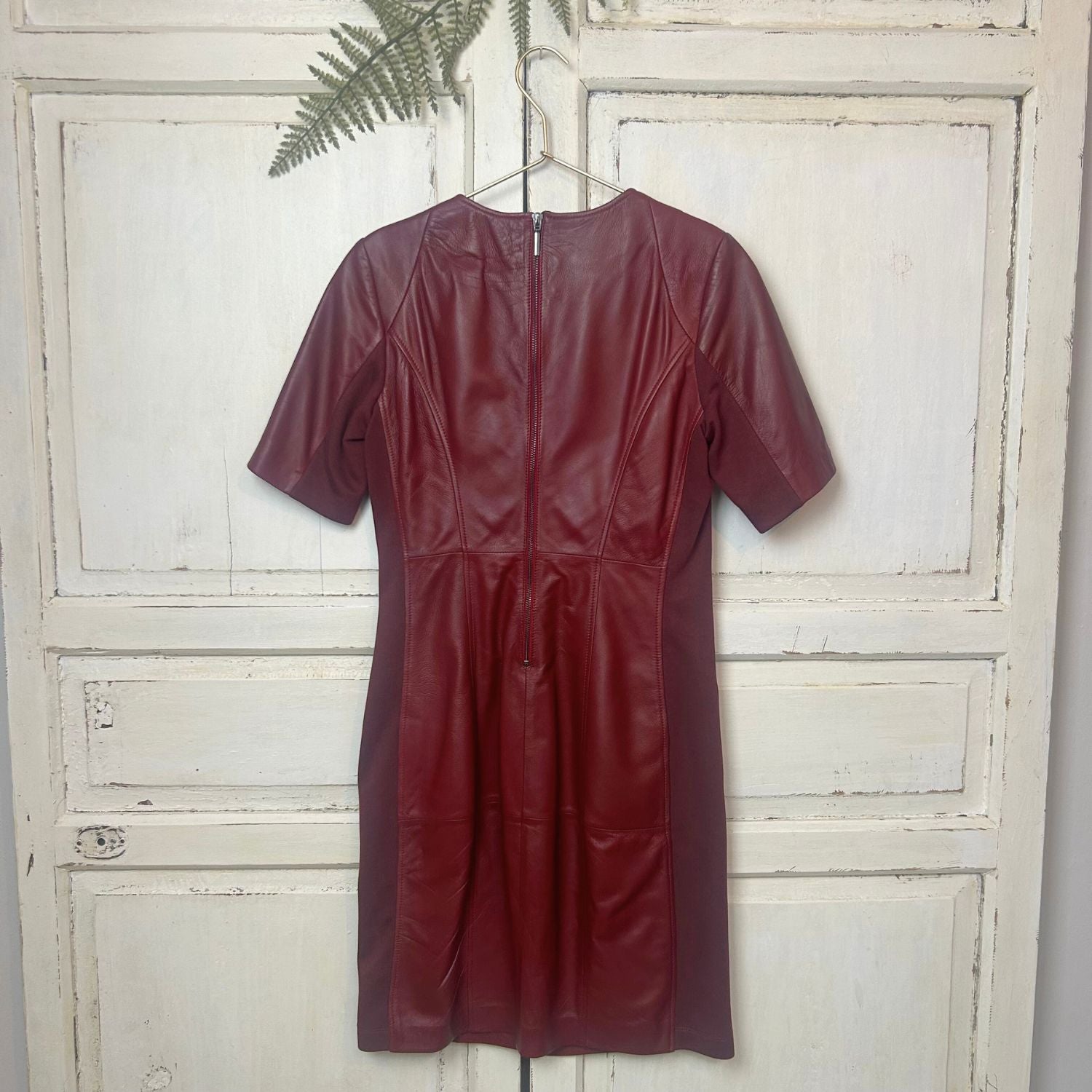 Mooi gesneden leren jurk met een rits bij de ronde halslijn en een stoffen strook van boven naar beneden aan de zijkant. Mooi te dragen met een schoen met een hak.