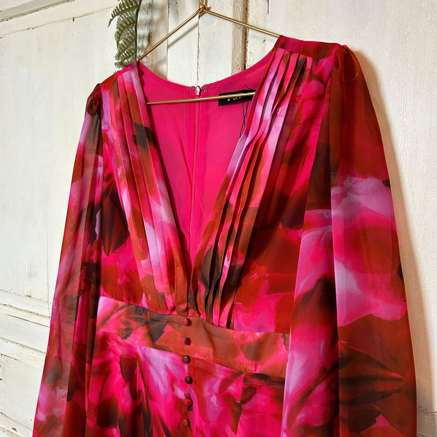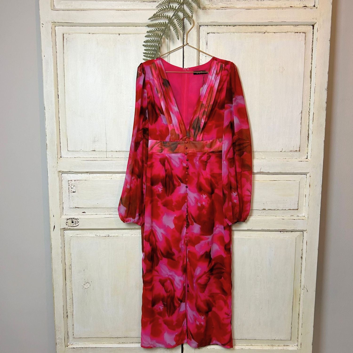 Prachtige rood/roze lang jurk met transparante mouwen en een hele diepe V-lijn die bijna tot het middel doorloopt. De knoopjes lopen van de taille tot beneden en er loopt een geplooide rand langs de V-lijn. Aan de achterkant loopt een rits van boven tot beneden. Met deze jurk maak je gegarandeerd een verbluffende entree.