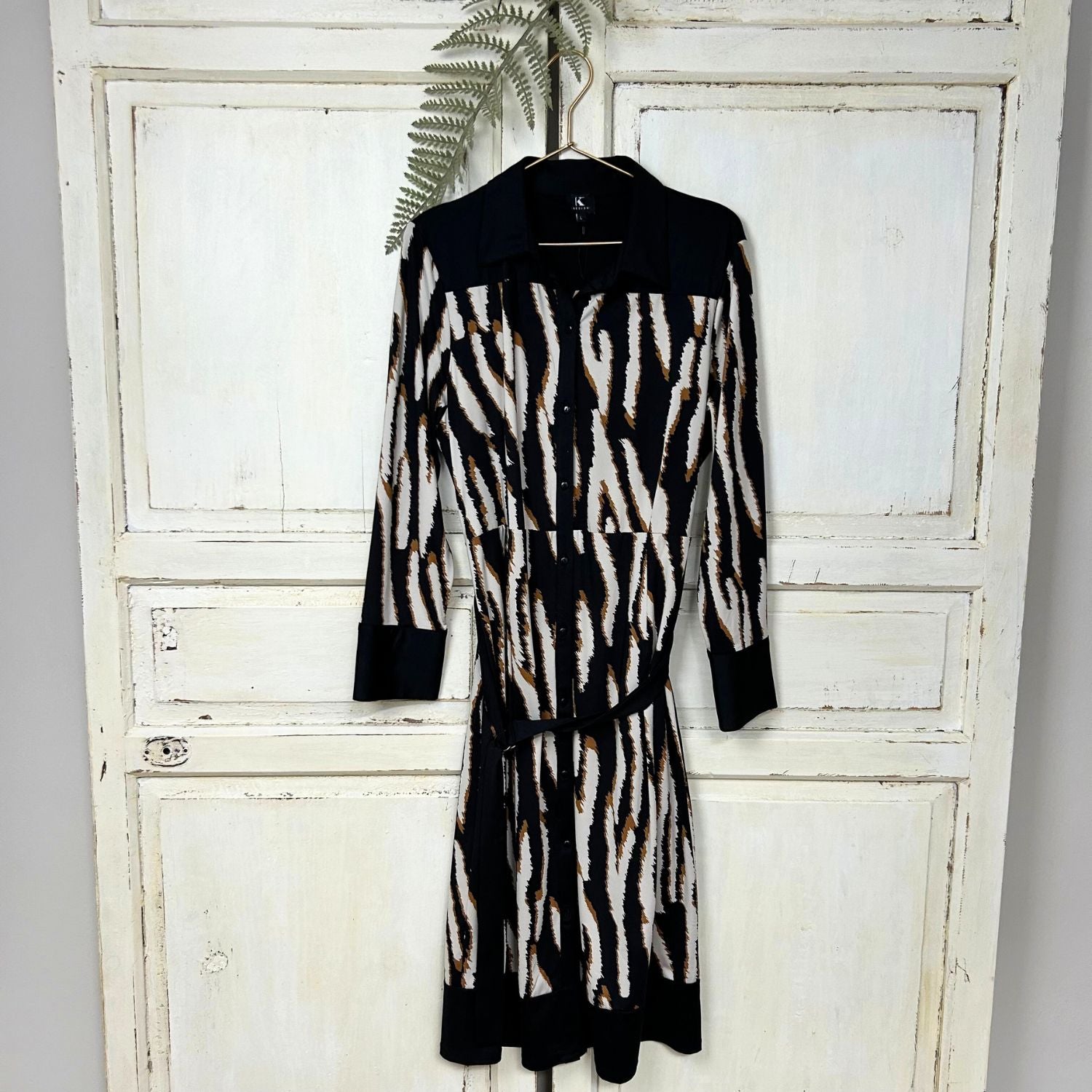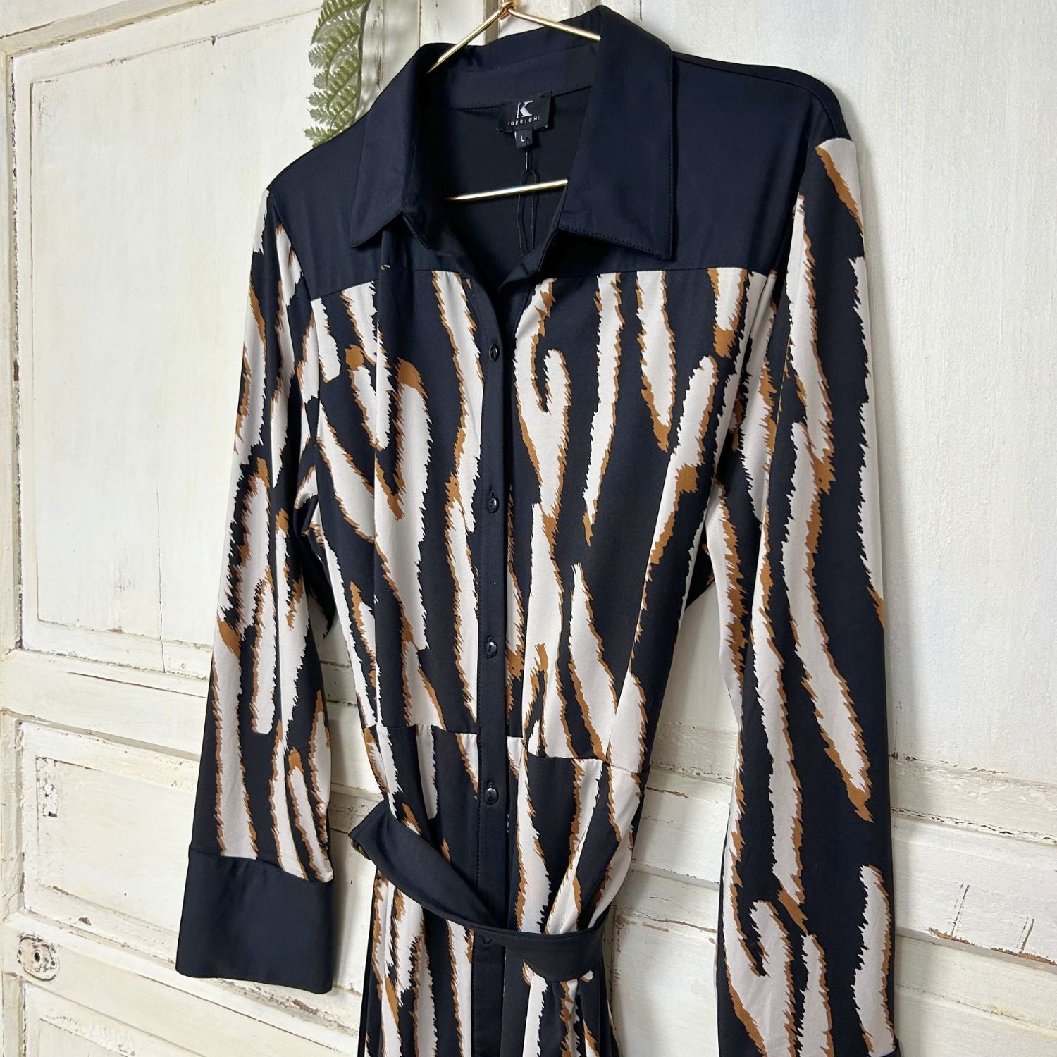 Hele mooie jurk in een prachtige kleurencombinatie. Gemaakt van een soepel vallende stof en sportief met een boot te dragen, of met sneaker of netjes met een hakje.