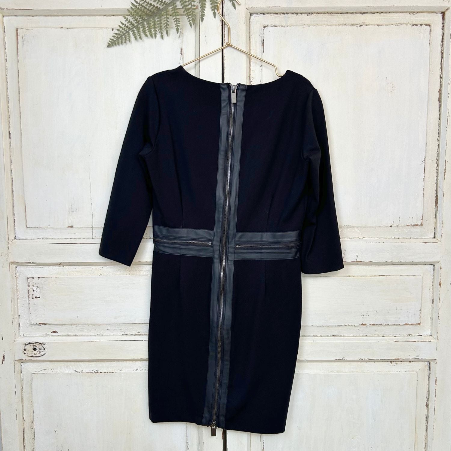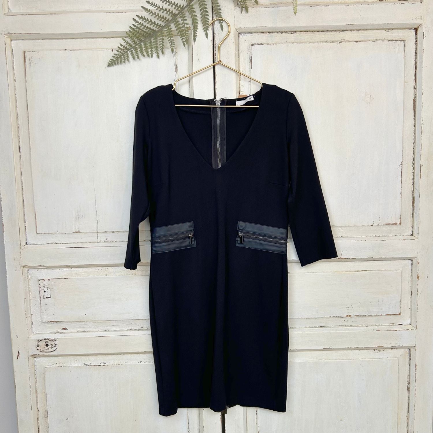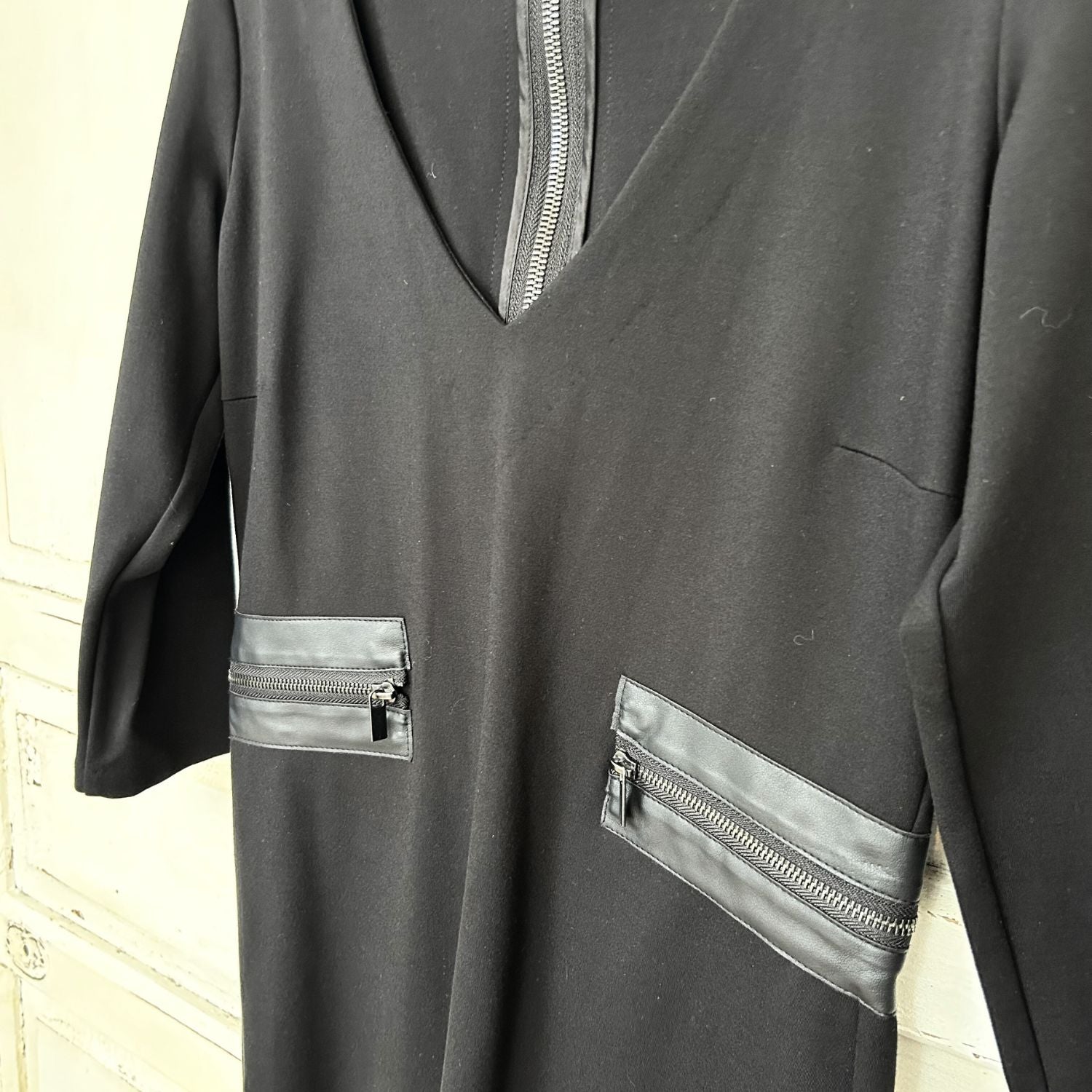 Deze hippe jurk heeft een V-hals en is aan de zijkanten afgezet met imitatieleer. Hij heeft een 3/4e mouw en aan de achterkant een two way zip die ook is afgezet met imitatieleer.