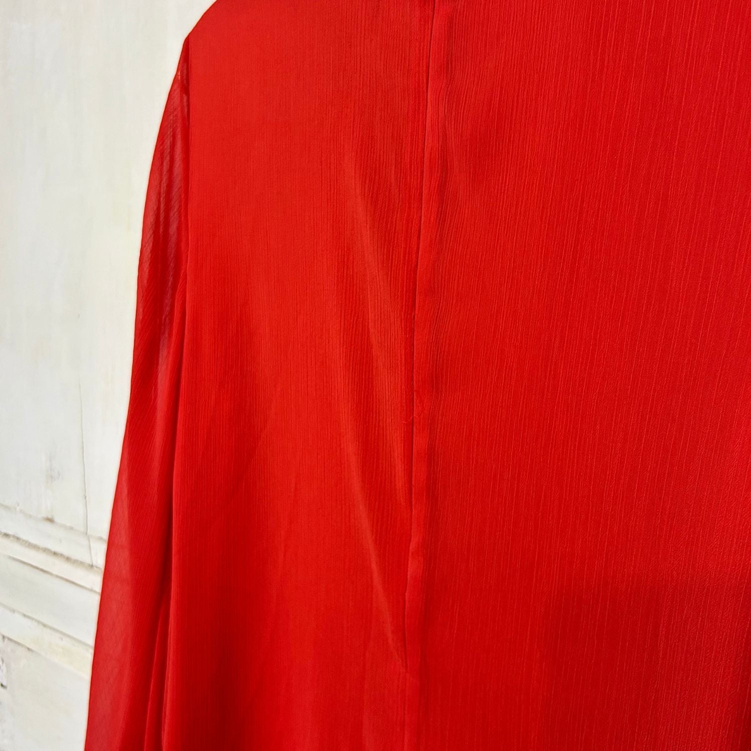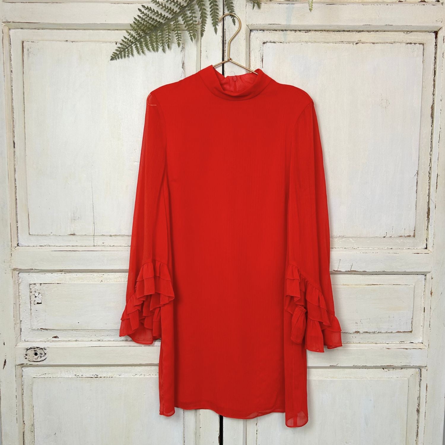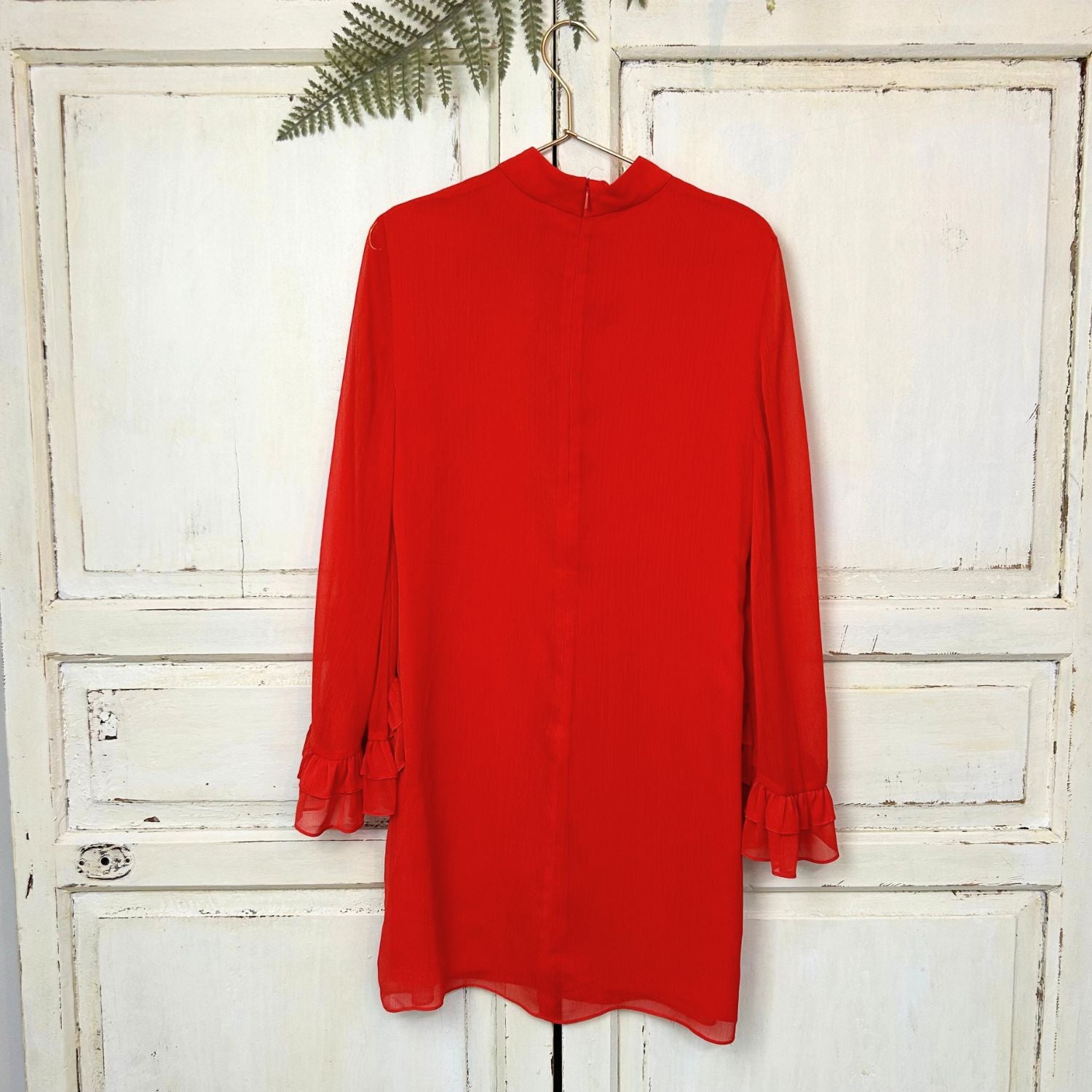 Een mooi prijsje voor deze prachtige rode jurk met opstaand boordje en met voile uitlopende mouwen.
