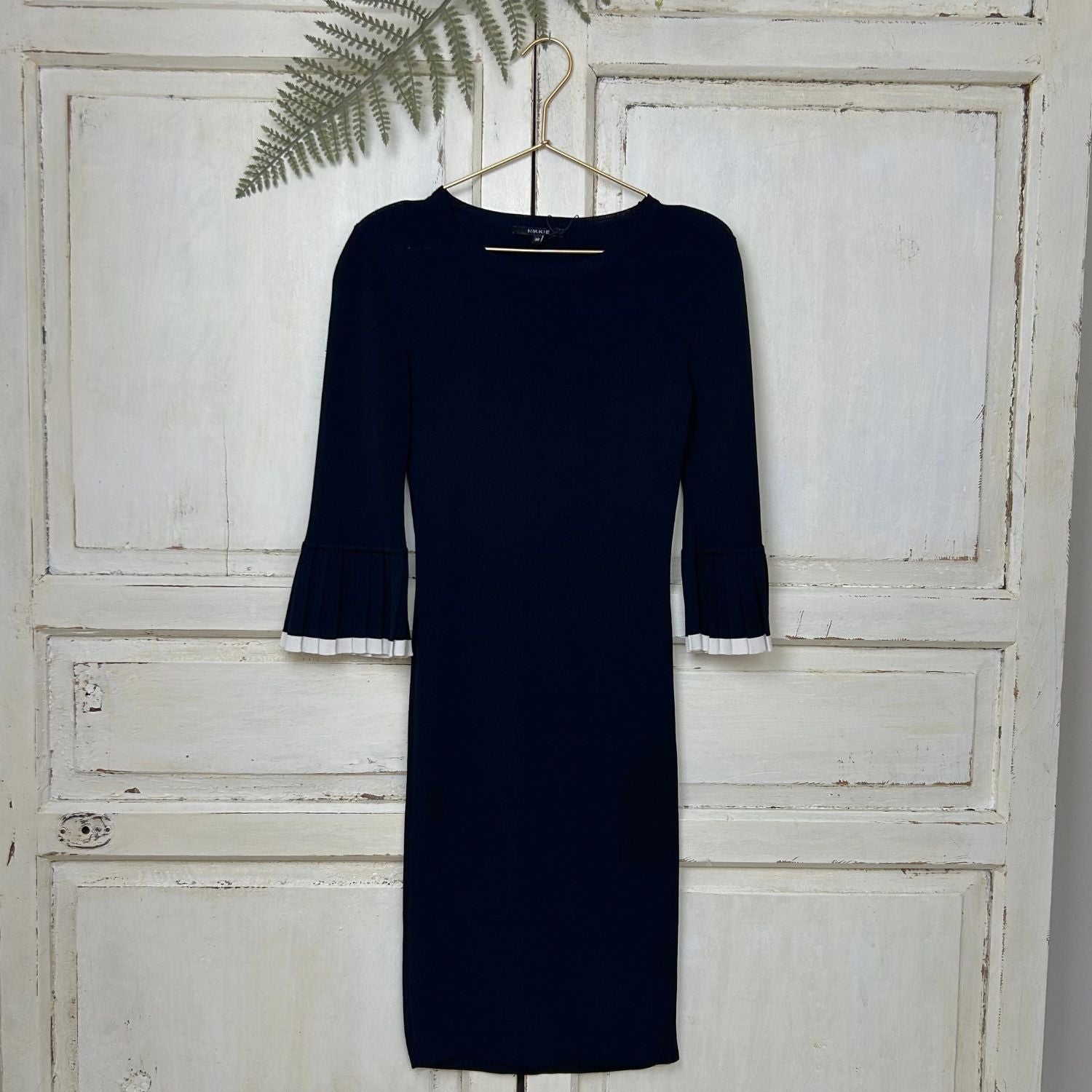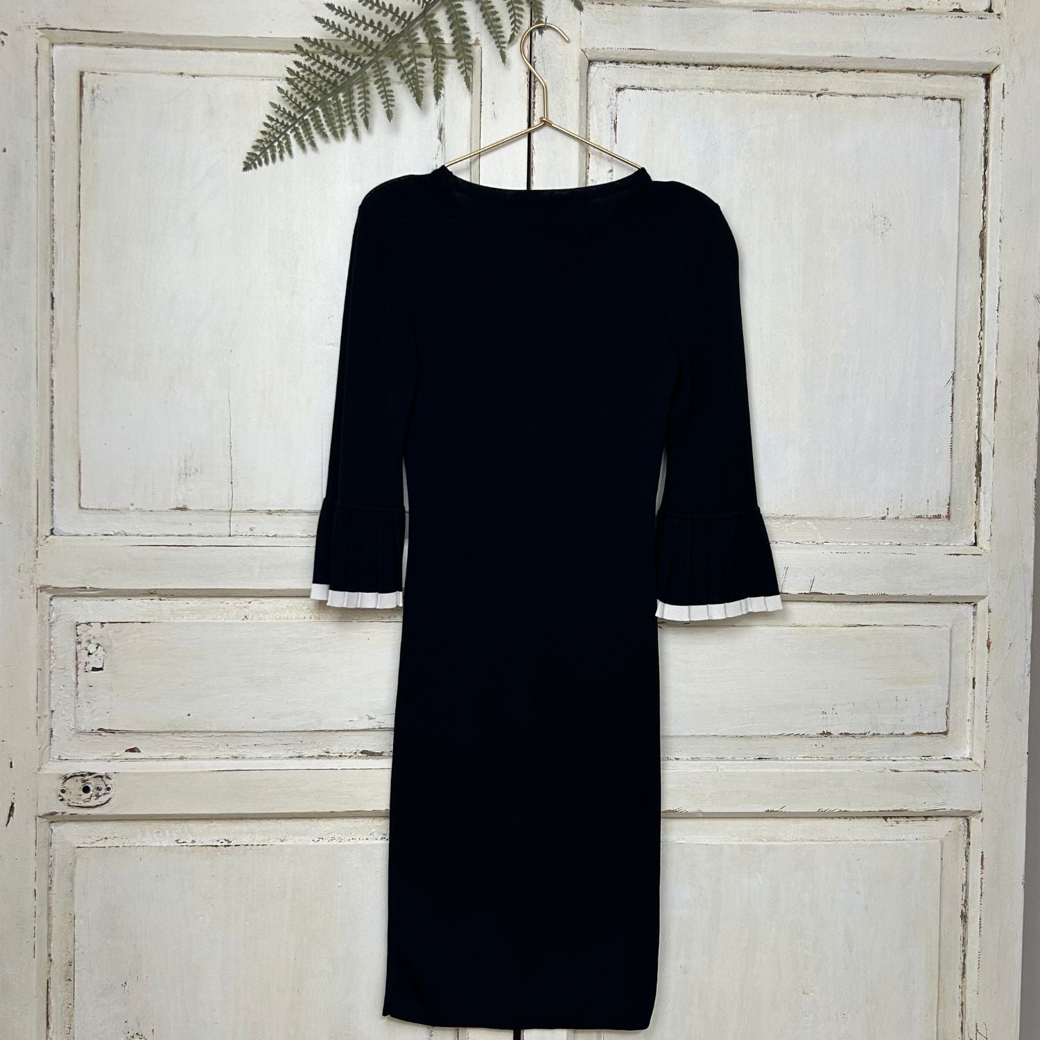 Zwarte Nikkie jurk met uitlopende plooienmouwen met een wit randje. Deze jurk valt tot op de knieën en bevat veel stretch.