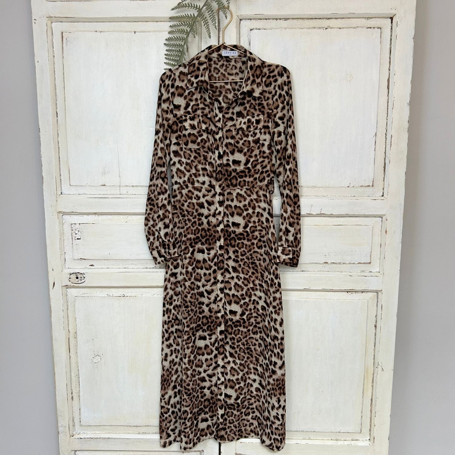 De trend van dit seizoen, tijgerprint! Deze lange jurk heeft borstzakjes en lusjes rond de taille.