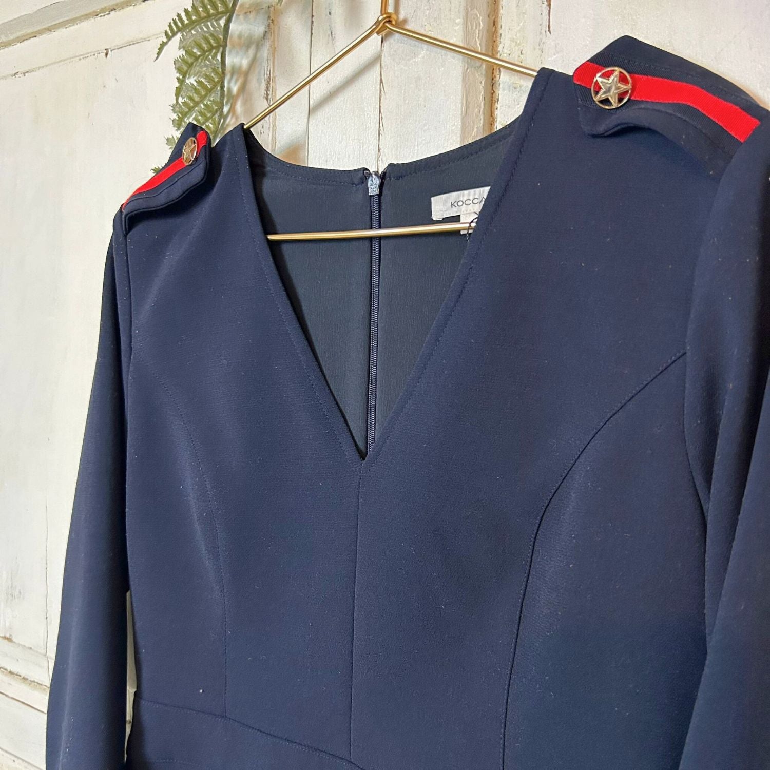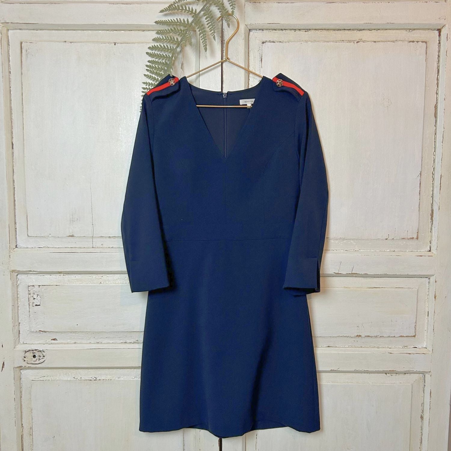 Los vallende donkerblauwe jurk met op de schouders een lus detail met een rood accent. Heeft een V-hals en een rits aan de achterkant.
