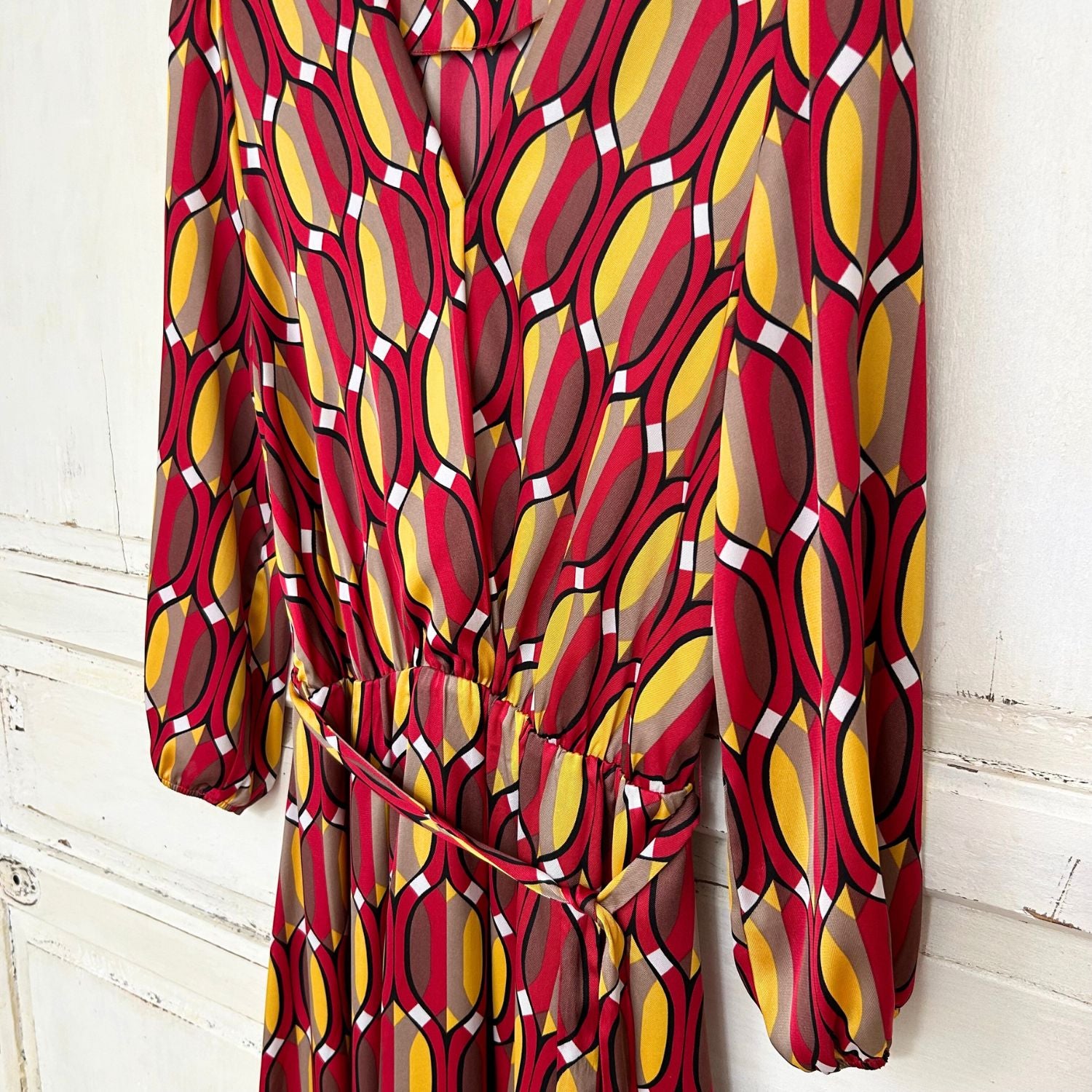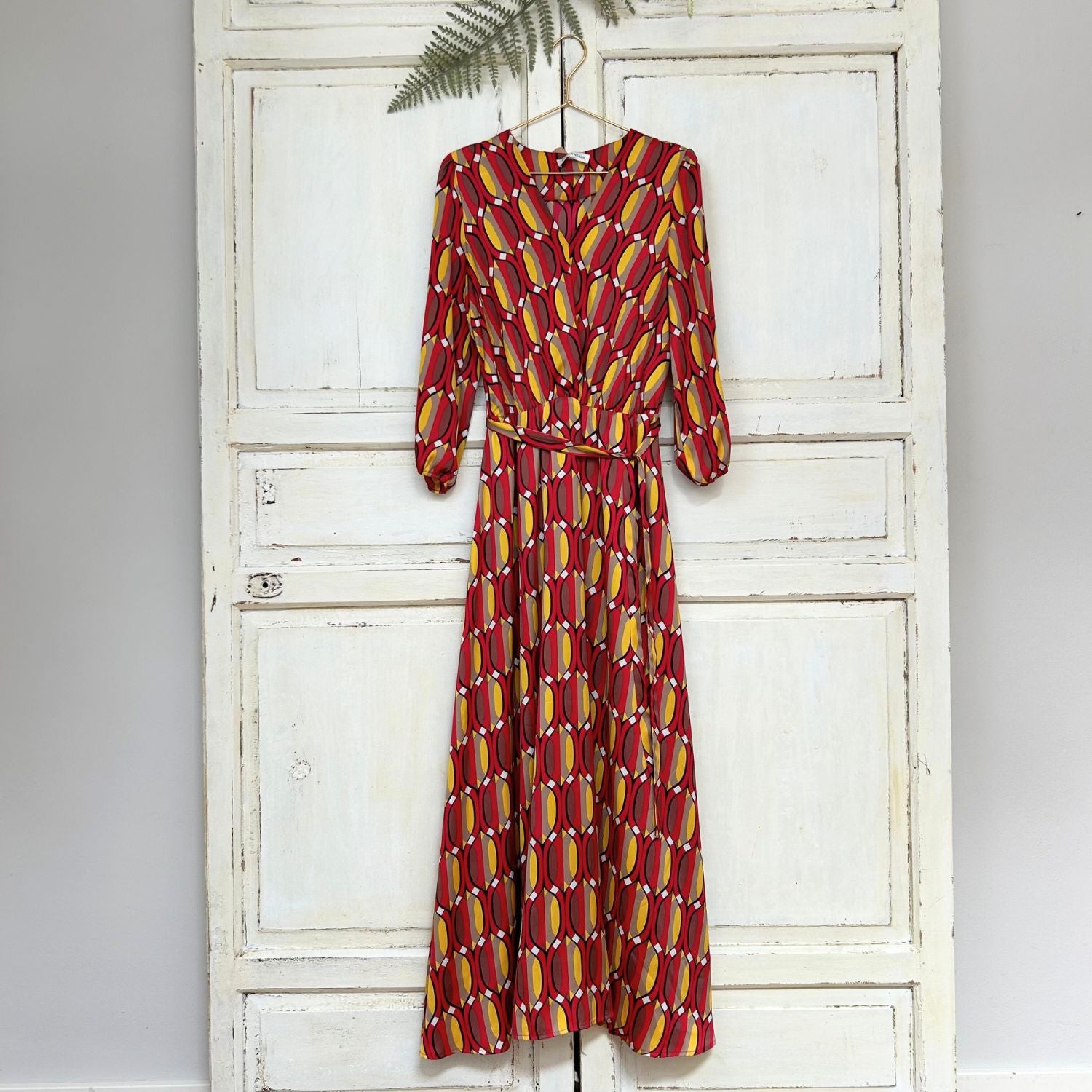 Opvallende mooie jurk door de prachtige kleurencombinatie. De jurk is mooi lang, heeft een V-hals en een koordje rond het middel. Met deze jurk steel je de show!