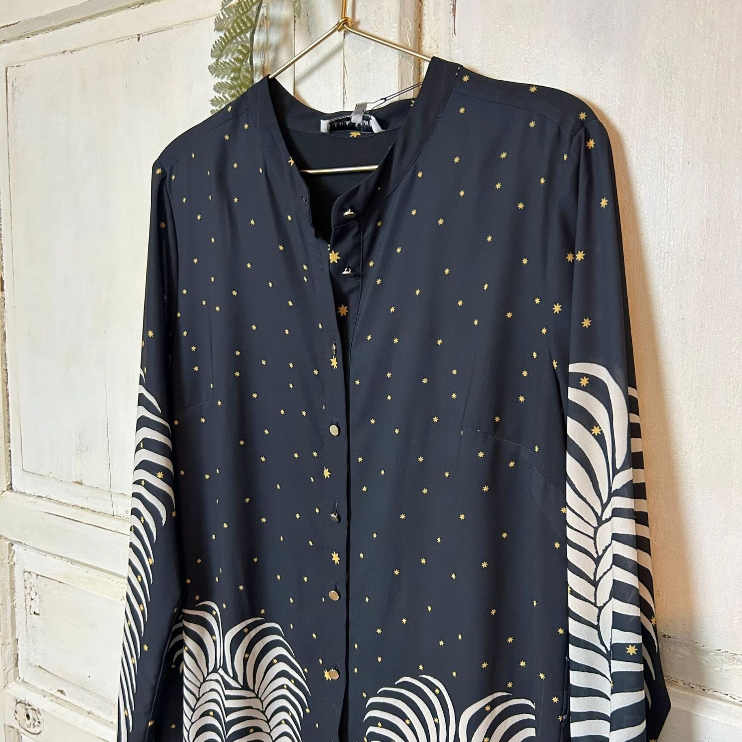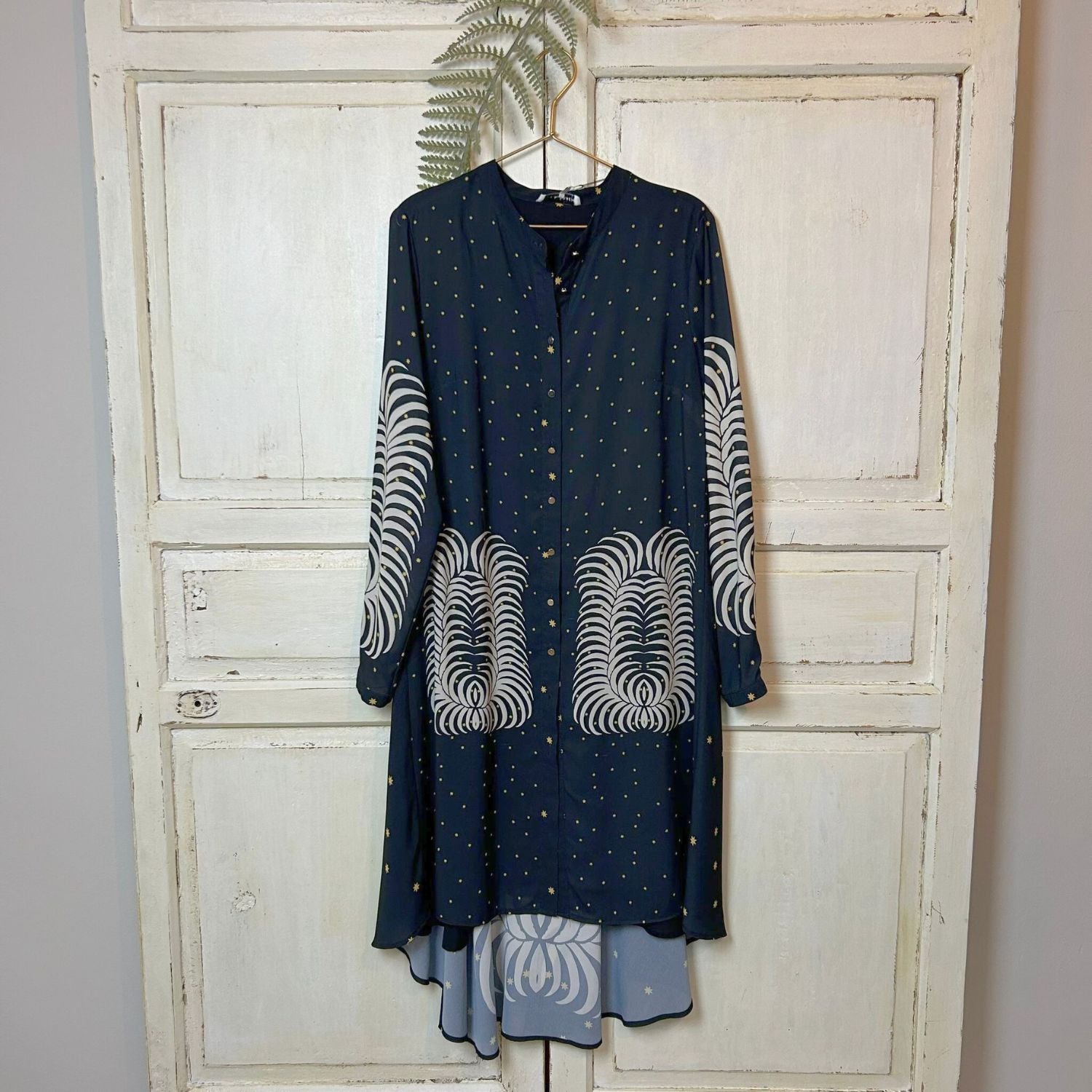 Hoe gaaf is deze donkerblauwe jurk? De jurk heeft gouden sterretjes en witte motieven. De jurk heeft gouden knoopjes en is langer achter dan aan de voorkant. Draag de jurk met een zwarte boots.