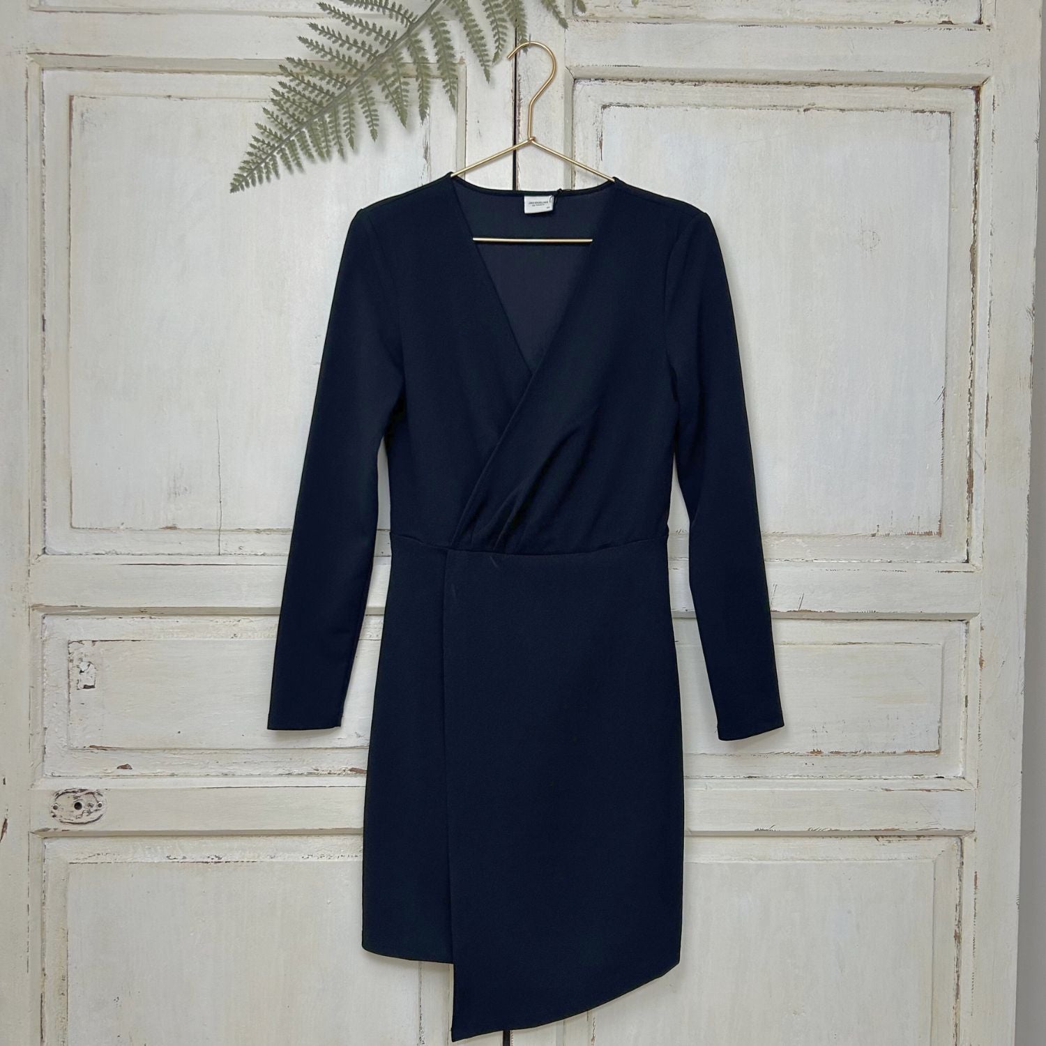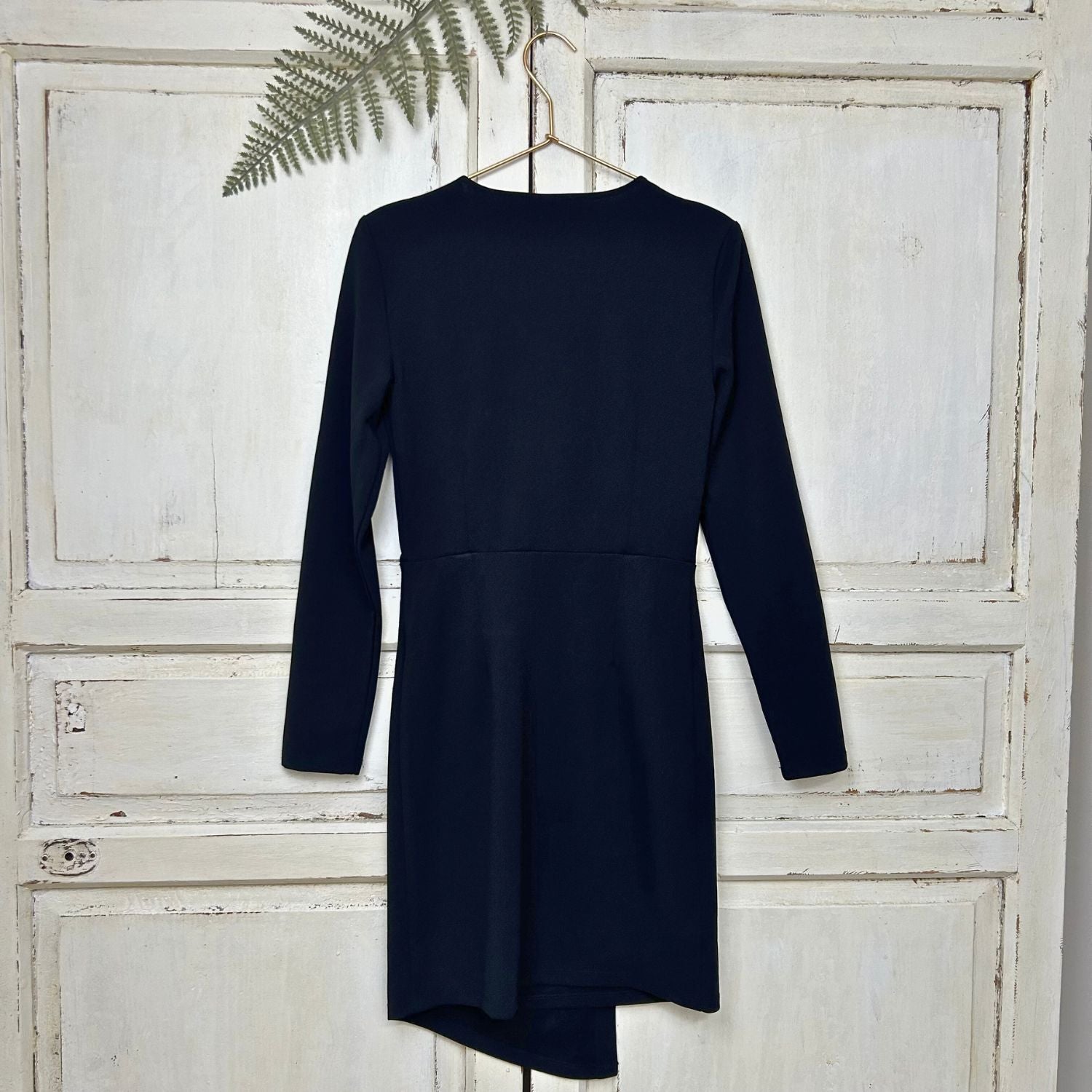 Korte zwarte overslagjurk met een V-hals. De jurk valt tot op de knie.