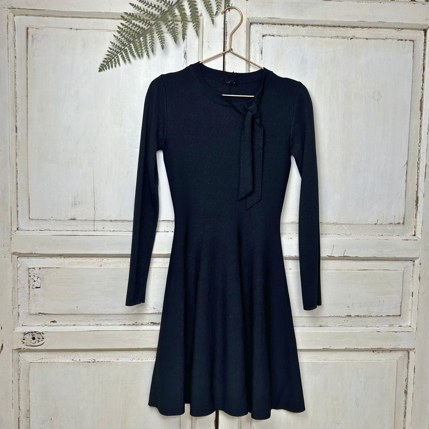 Een zwarte Nikkie jurk met een kleine glitter. De jurk heeft onderaan een klokkend en plooiend model. Bovenaan bij de hals zit een strik. De jurk valt tot op de knieën en bevat ook stretch.
