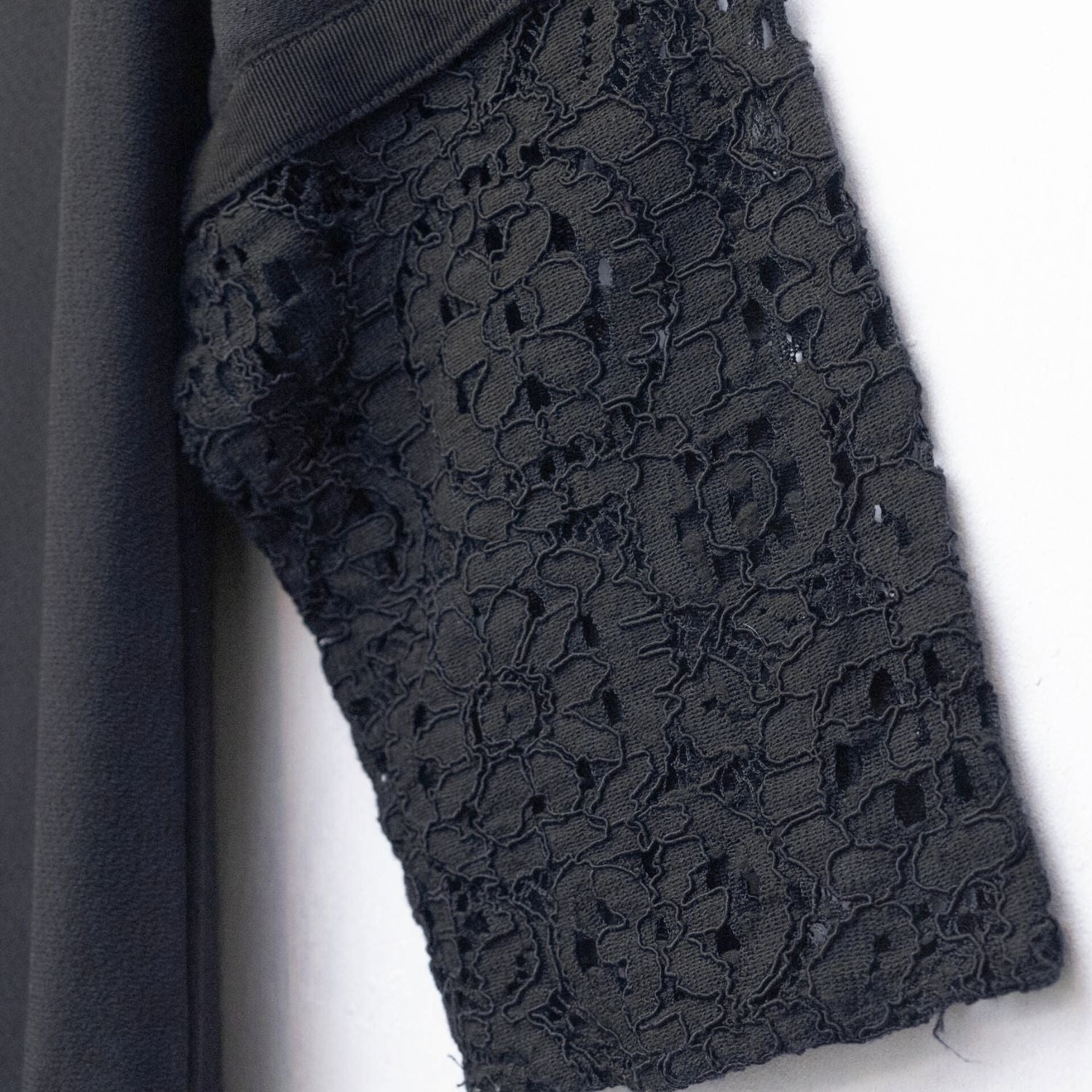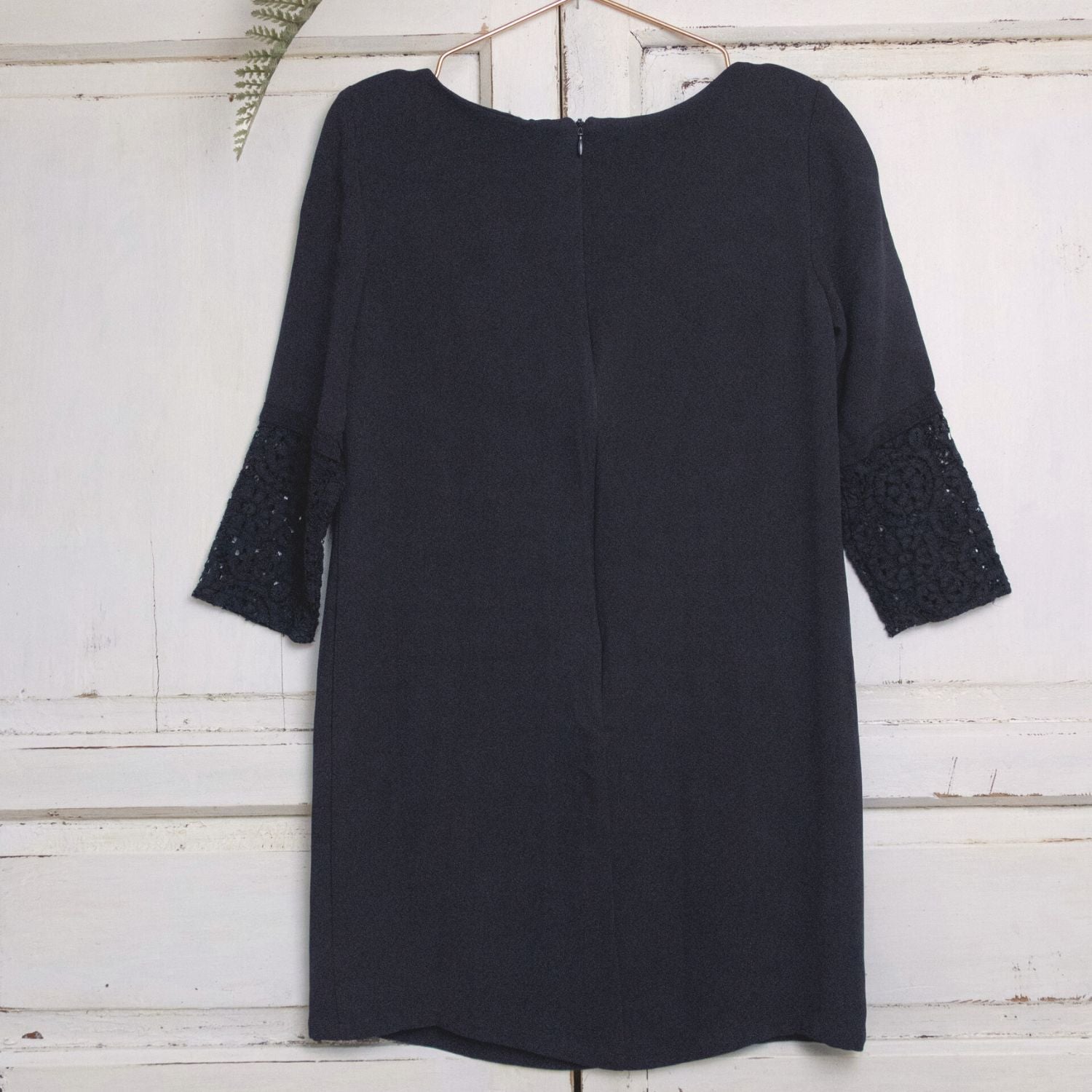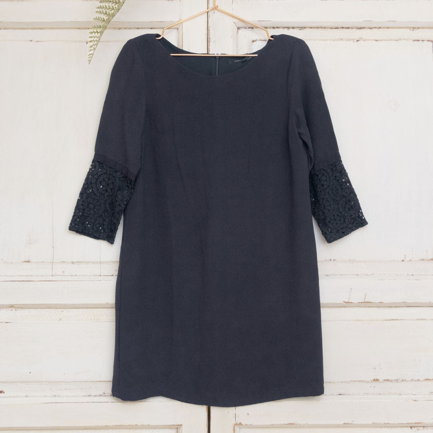 Dit mooie korte zwarte jurk heeft een 3/4e mouwtje die onderaan prachtig is afgewerkt met kant. Het jurkje heeft een mooi klassiek model met een ritsje aan de achterkant.