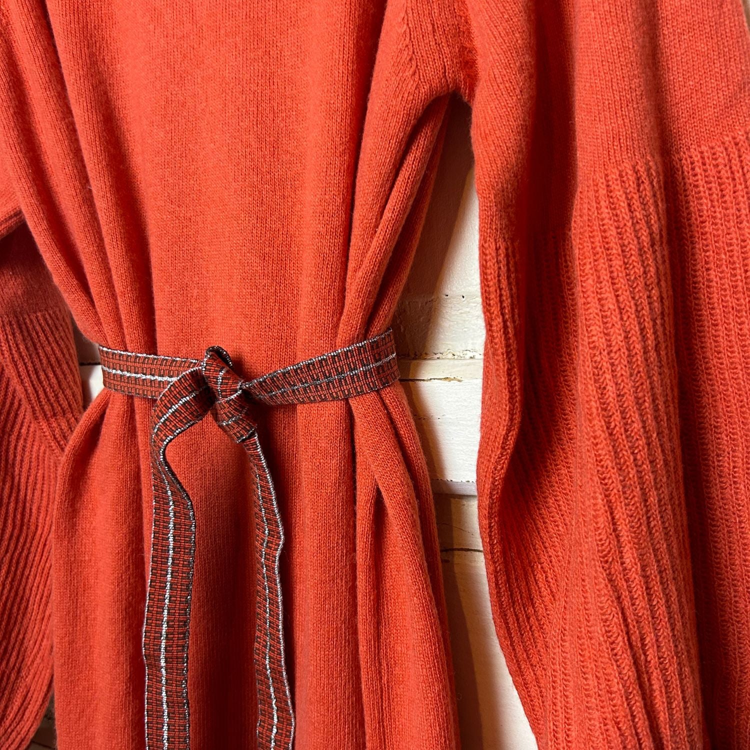 Een prachtige roestkleurige wollen coljurk. De jurk is lekker warm, ideaal voor de koudere dagen. De mouwen zijn iets wijder en de jurk heeft een leuk riempje om de taille.