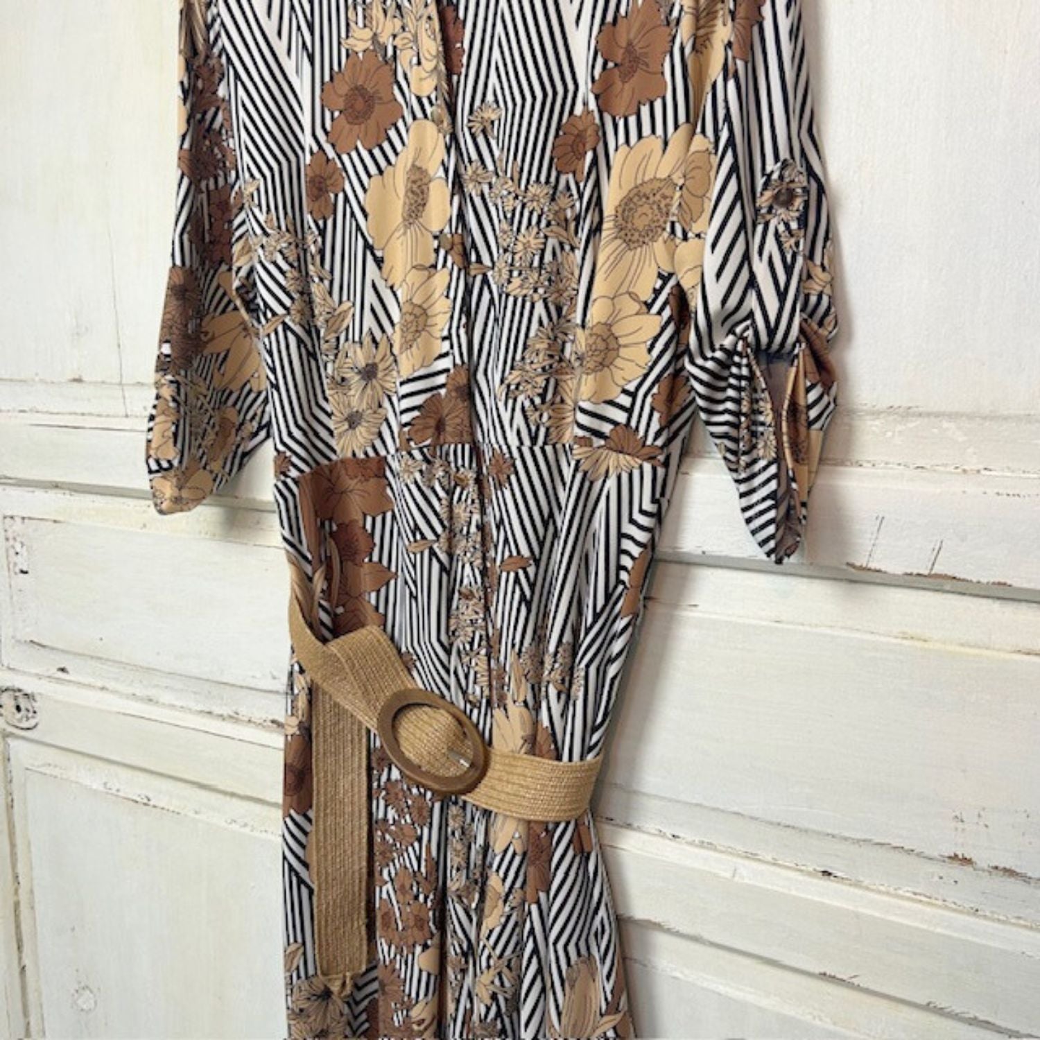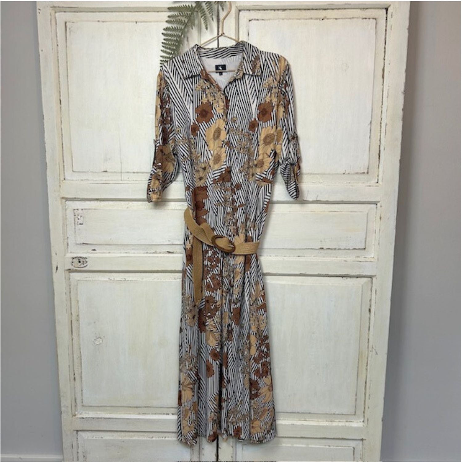 Mooie frisse jurk. Opvallend door de combinatie van kleuren en de mooie rieten riem voor om het middel.