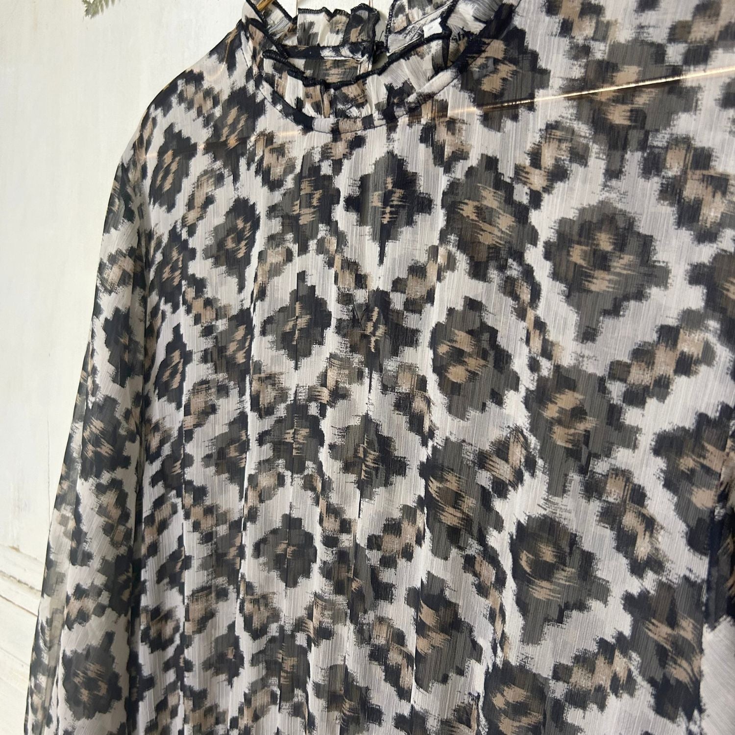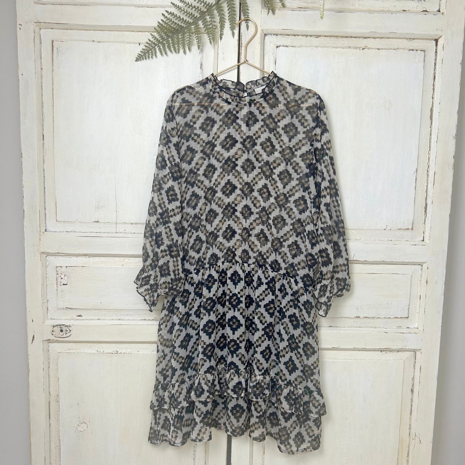 Leuke jurk van een transparante stof, met twee ruffel randjes onder aan de rok.