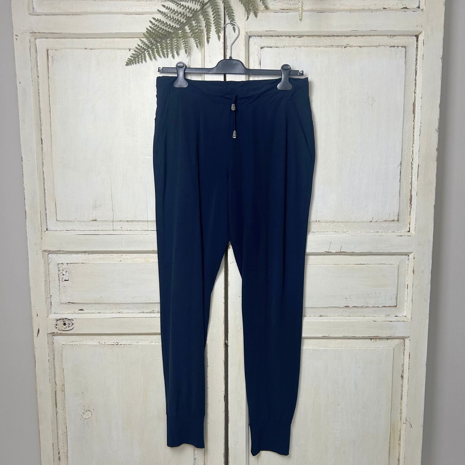 Een mooie gladde pantalon van travel kwaliteit met op de billen twee zakjes.
