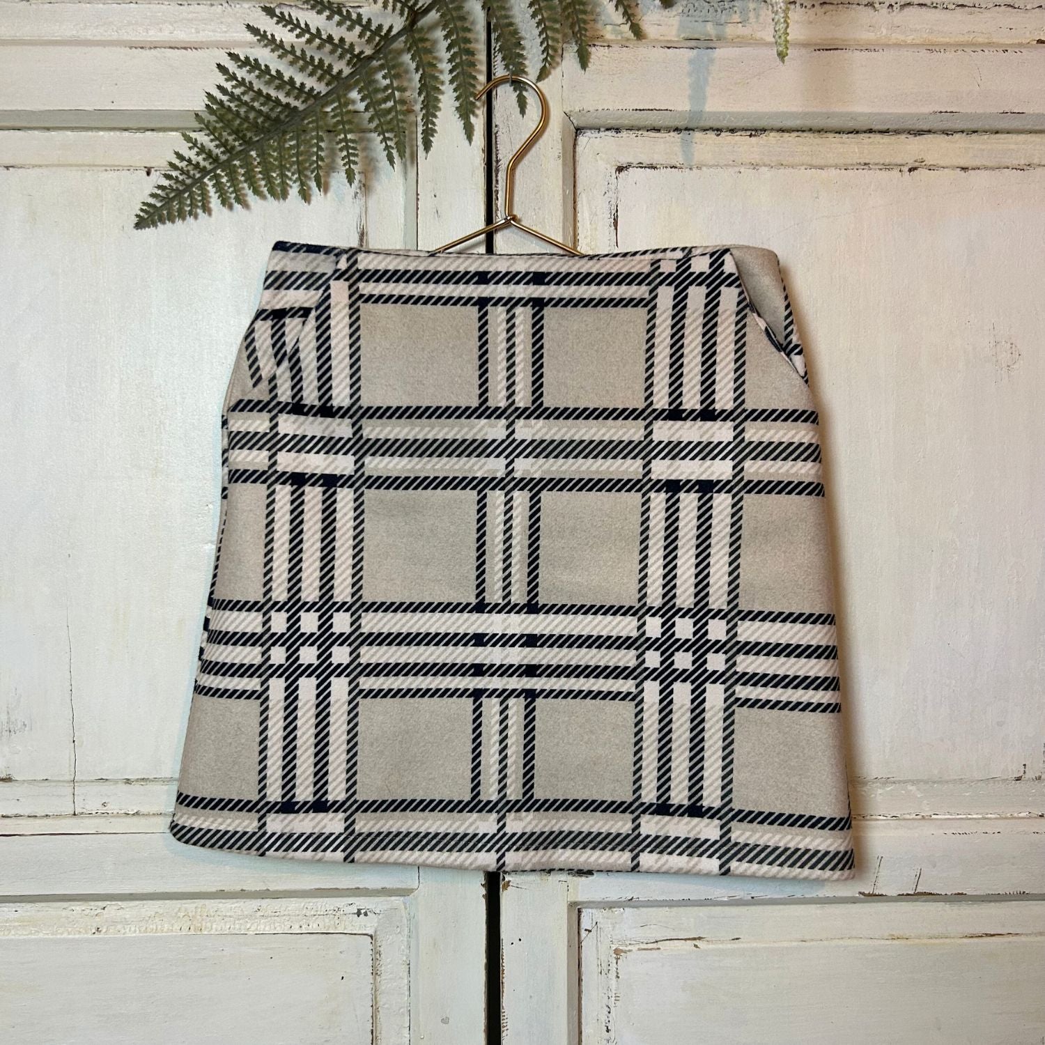 Dit korte beige ruiten rokje heeft een vilten stof. Het rokje heeft 2 steekzakken. Draag het rokje met een zwart top en zwarte hoge laarzen voor een stoere look!