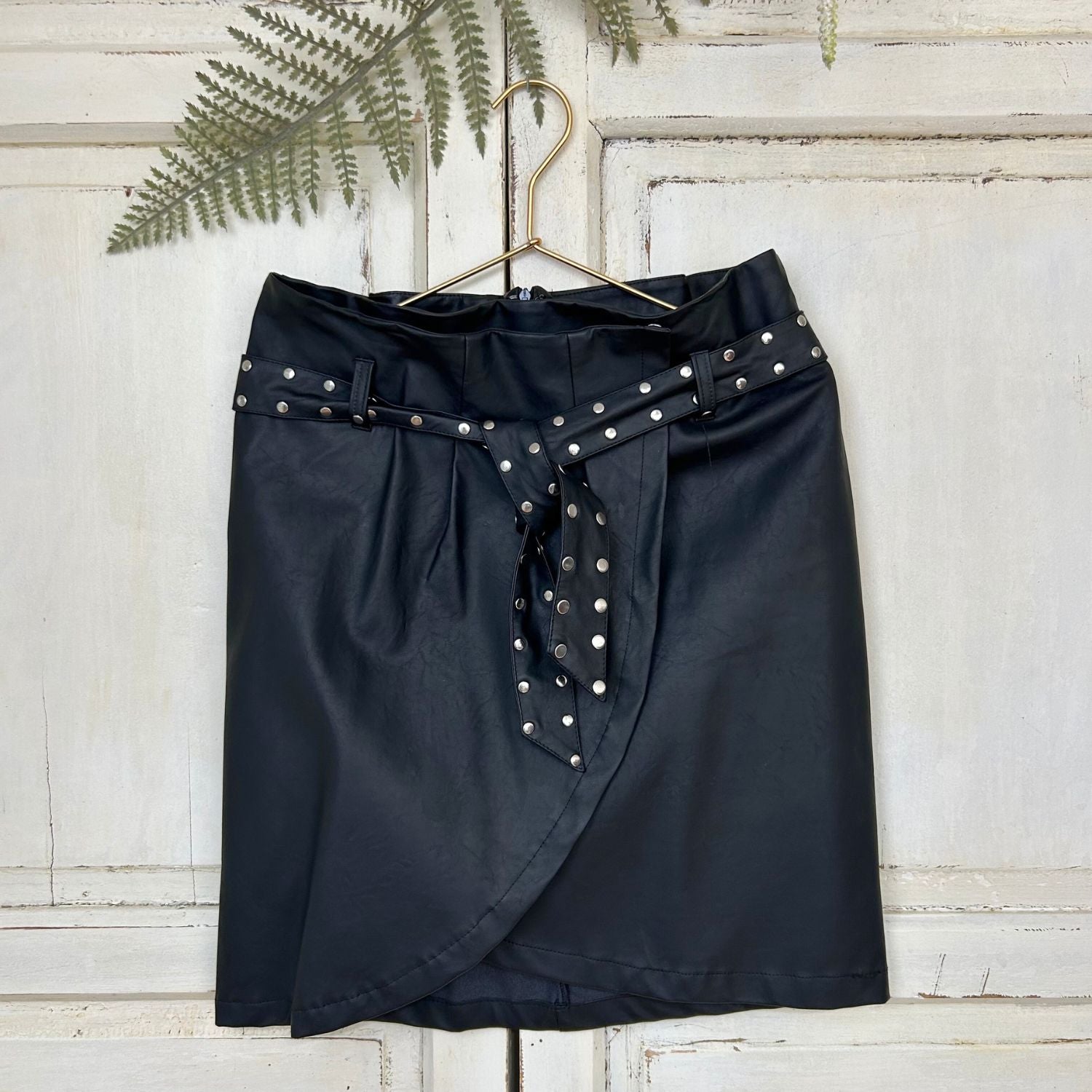 Hoe stoer is deze rok! Heel mooi afgewerkt met een riem vol met studs. Deze rok valt op door het mooie imitatieleer, het model (voor overslag) en de ontzettende mooie uitvoering. Een echte eyecatcher en stoer te combineren met een boot of laarsje. Mooi met een blouse of oversized gebreide trui.