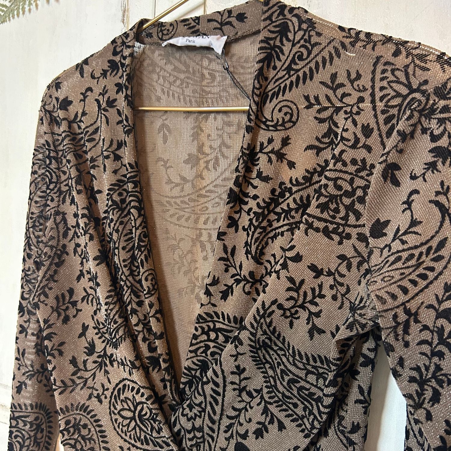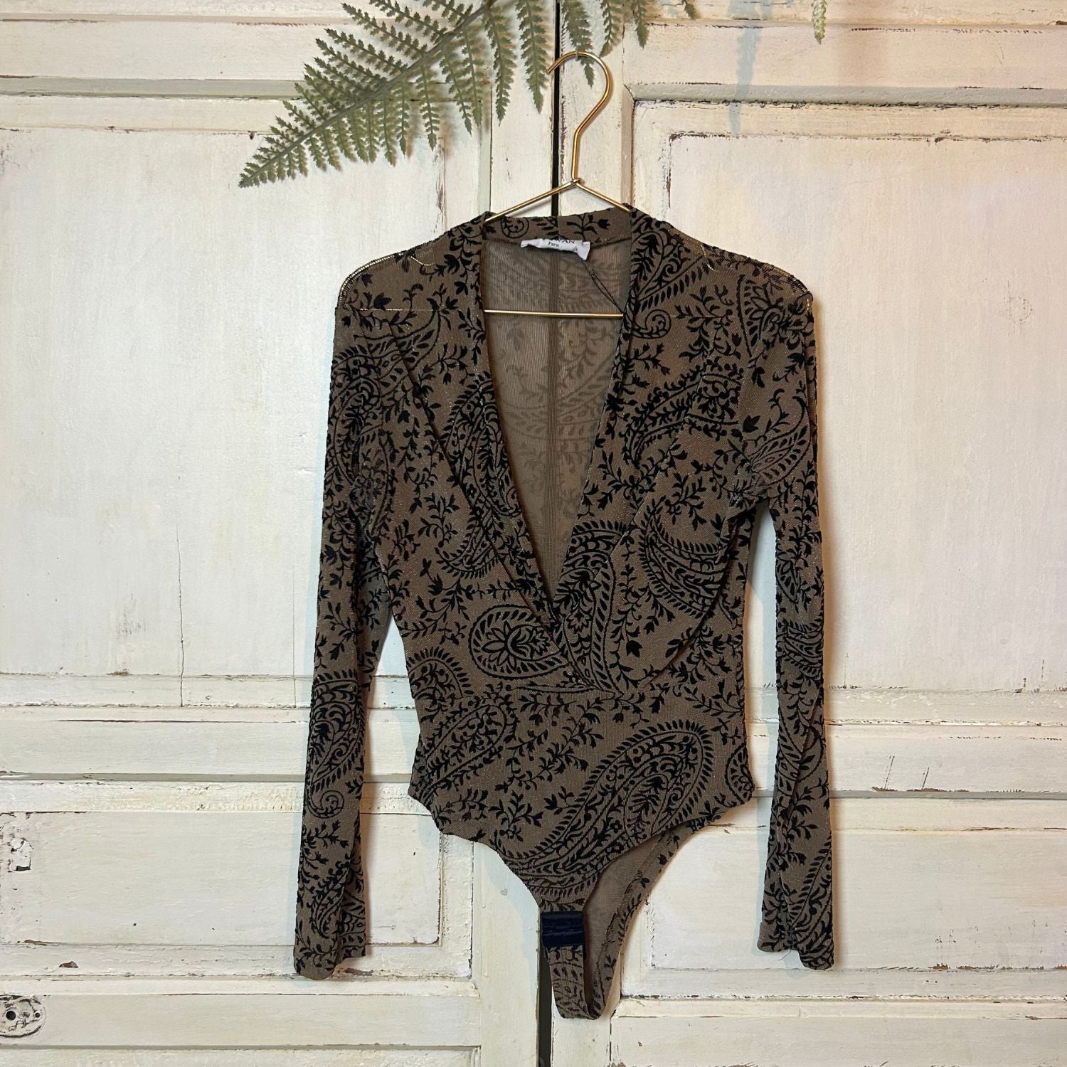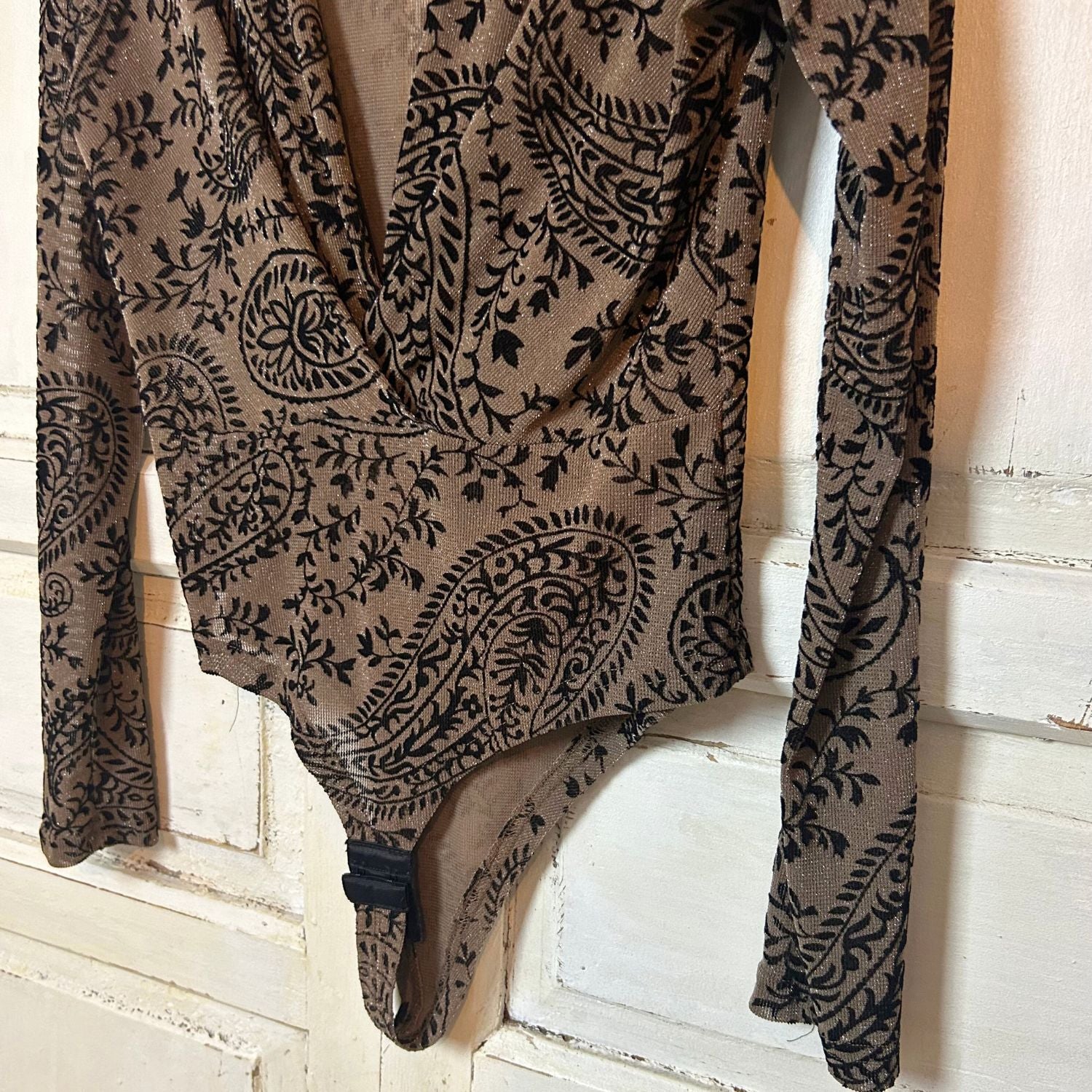 Prachtige body met een diepe V-hals. De top is gemaakt van een bruin glitterstofje en heeft zwarte patronen. De sluiting van de body is met haakjes.