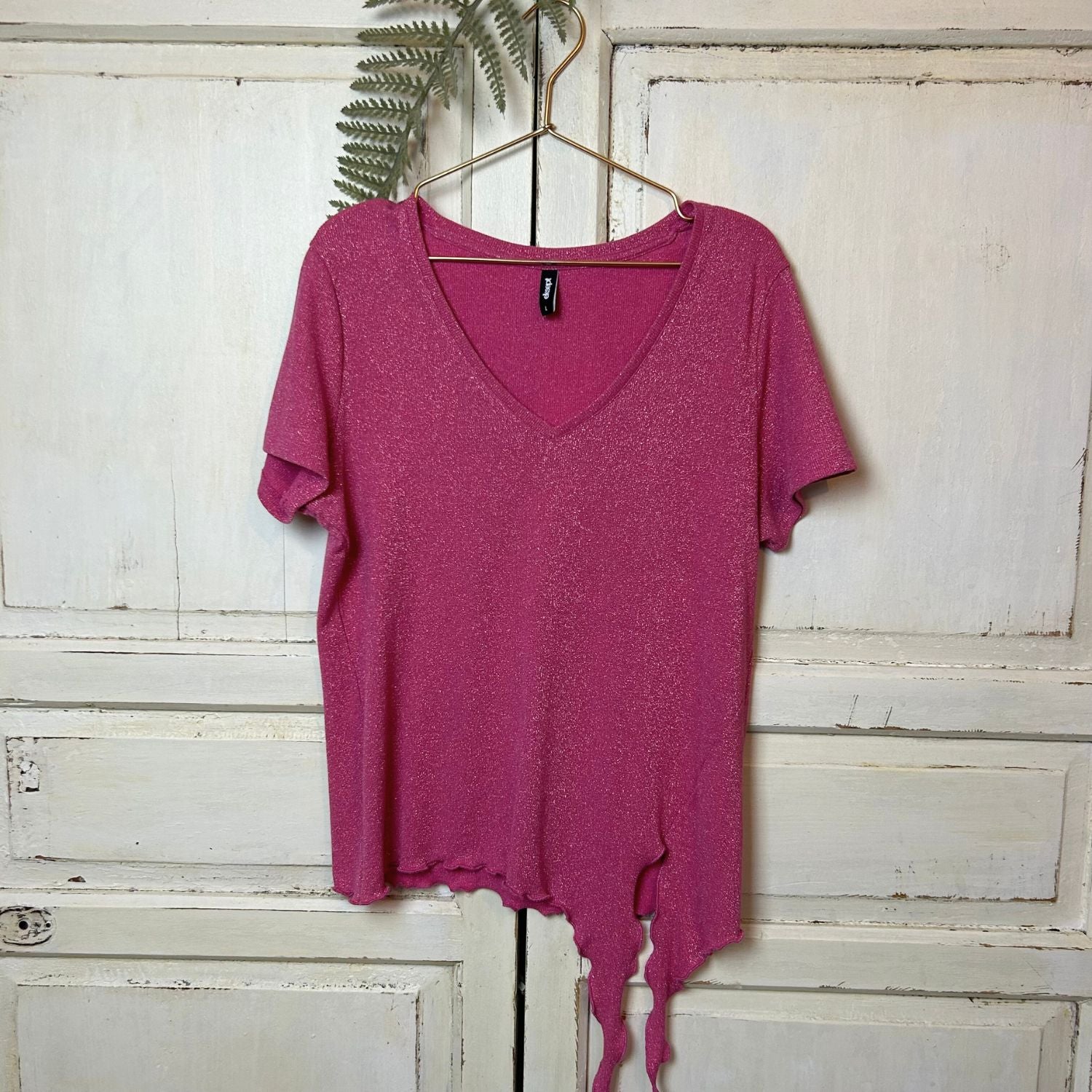 Leuk opvallend en feestelijke glittertop die je onderaan kunt knopen. Heel leuk onder een jasje op een jeans of pantalon.
