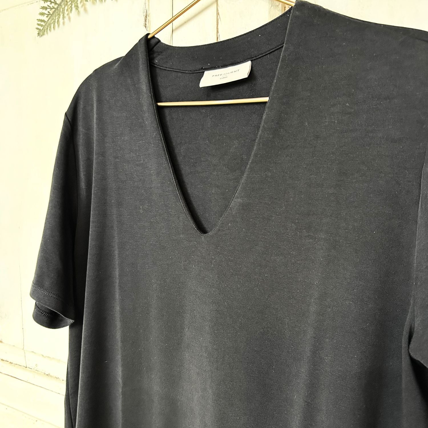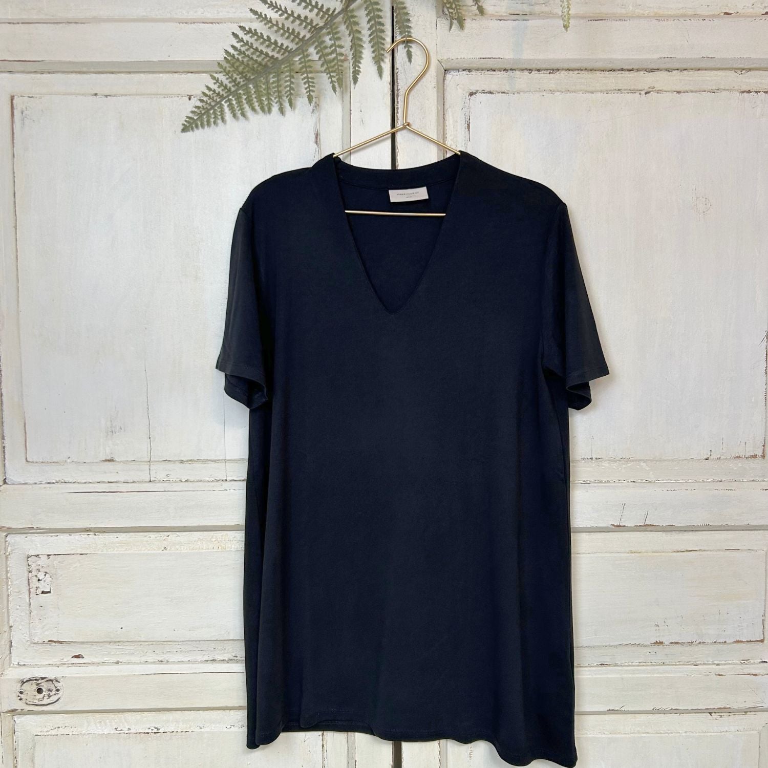 Dit los vallend model heeft een V-hals en korte mouw, prima onder een jasje te dragen.