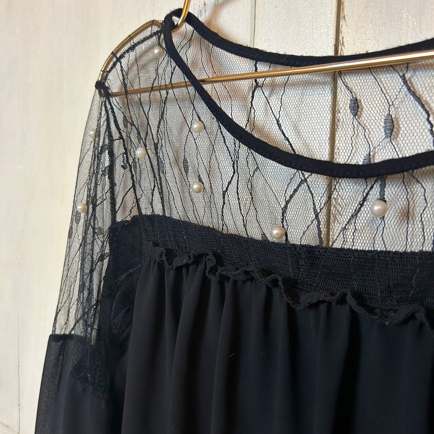 Prachtige zwarte top met lange mouwen met een transparante hals met parels. De top is gemaakt van een voile stofje. Perfect voor speciale gelegenheden!
