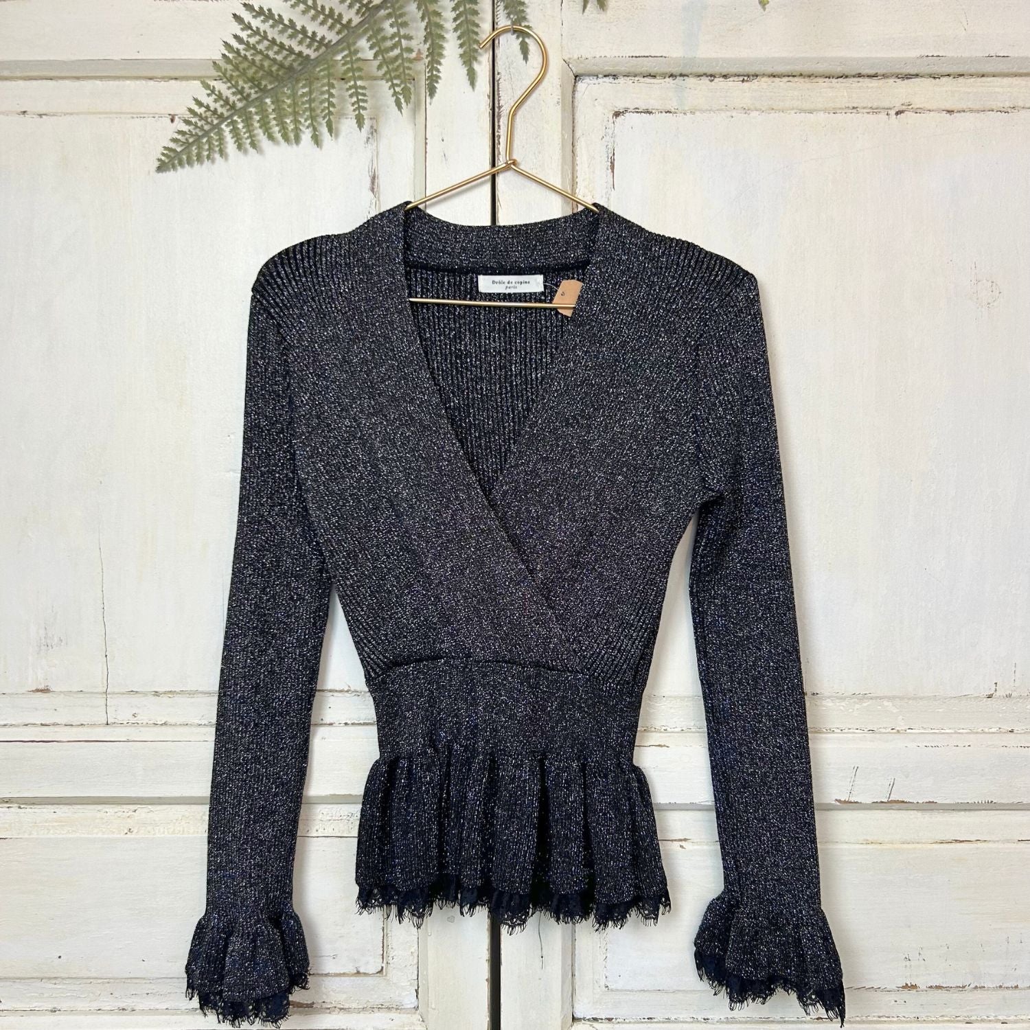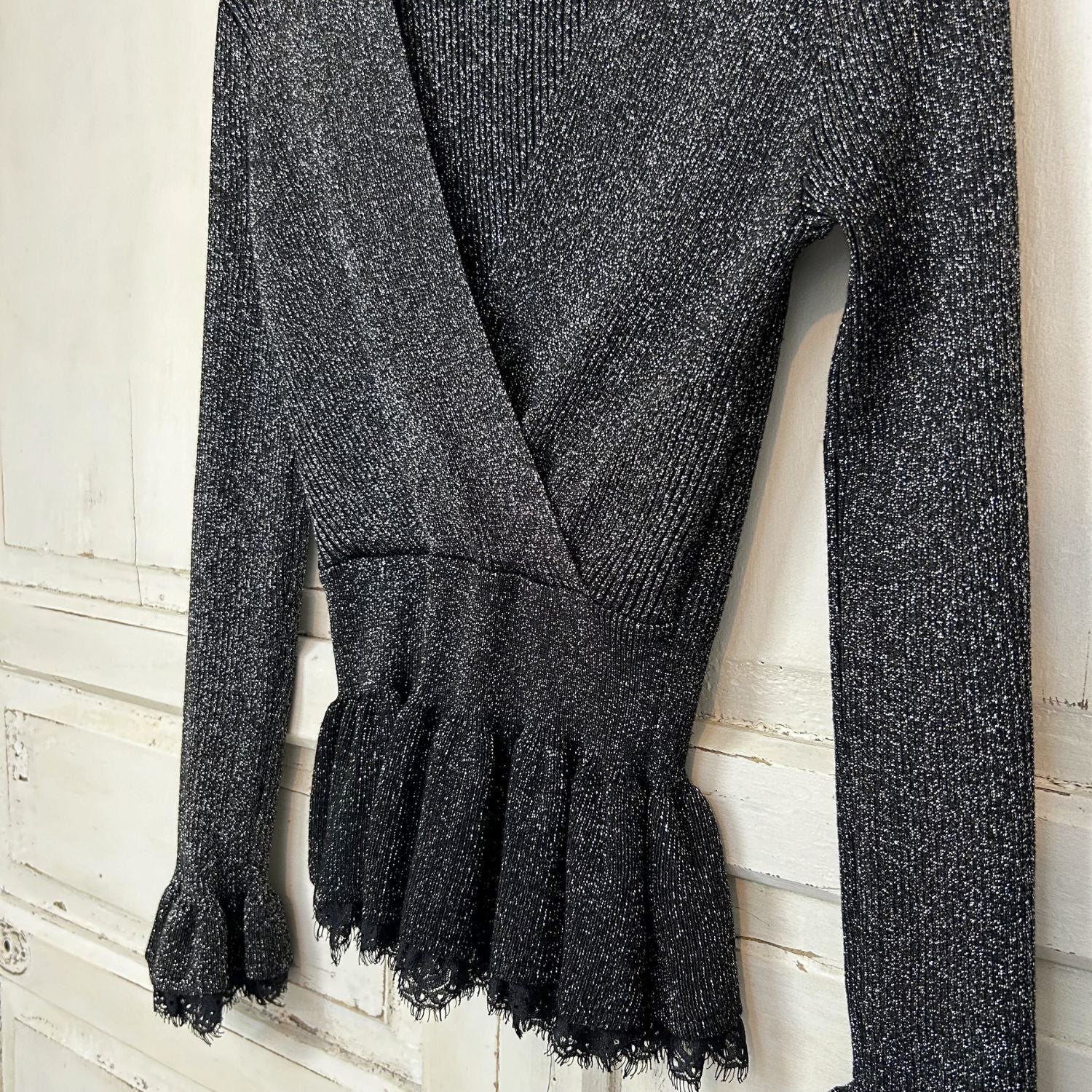 Prachtig voor de feestdagen deze top met een diepe V-hals en een feestelijk glittertje in de stof. Leuk detail is de strakkere taille en de uitlopende mouw met kant randje.