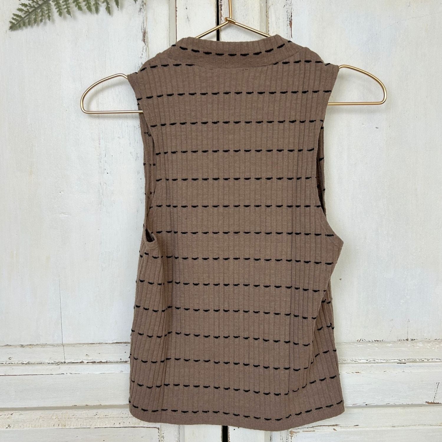 Een mouwloze bruine top met zwarte stiksel details. De top is gemaakt van een fijne kwaliteit stof en bevat een beetje stretch. Combineer de top met een zwarte blazer en een zwarte pantalon voor een chique look.
