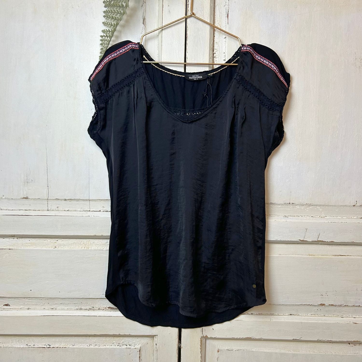 Leuke zwarte top met kanten details en een kleurrijk randje op de schouders.