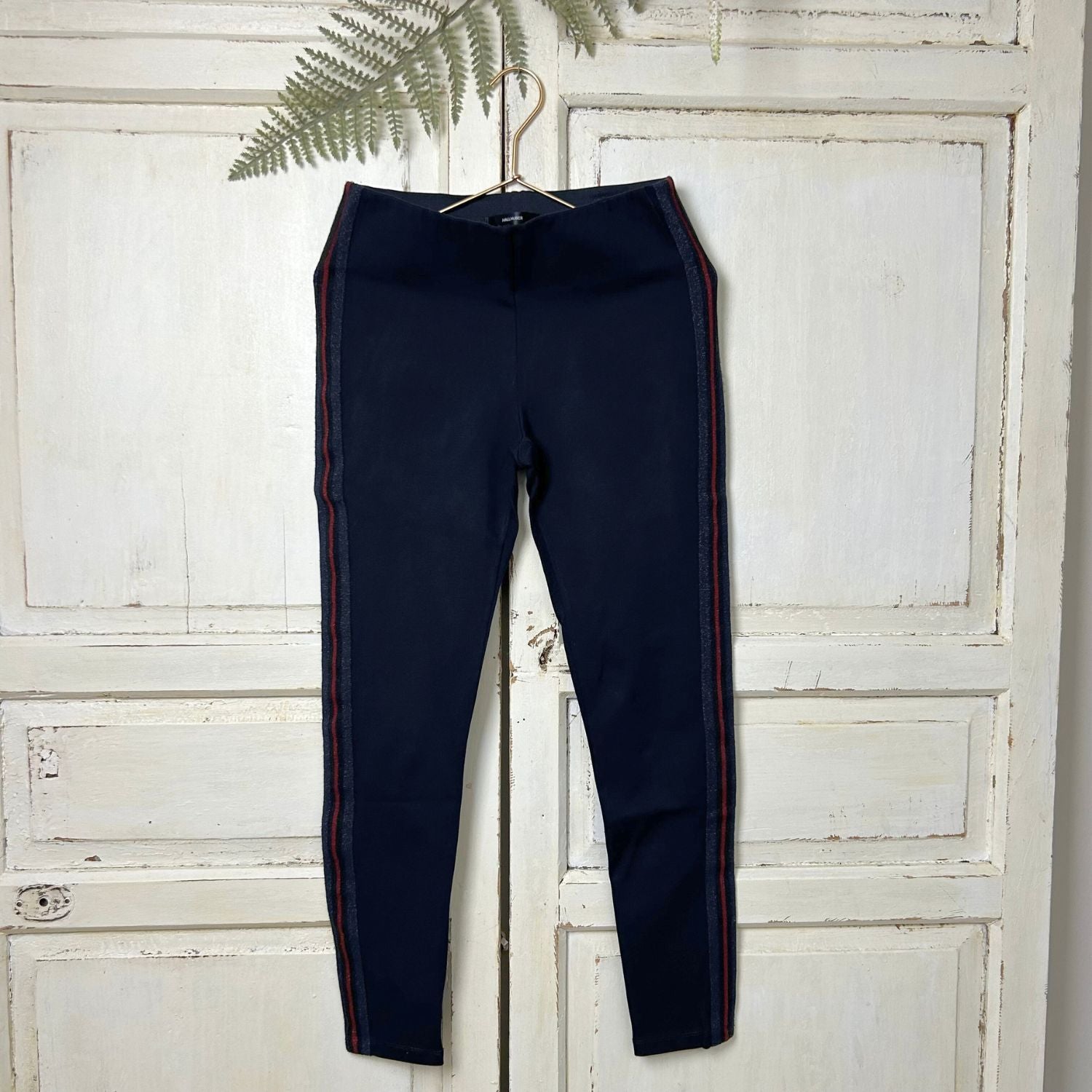 Deze tregging zit aangenaam strak om je benen. Leuke door de blauwe en rode glitterstrepen aan de zijkant.