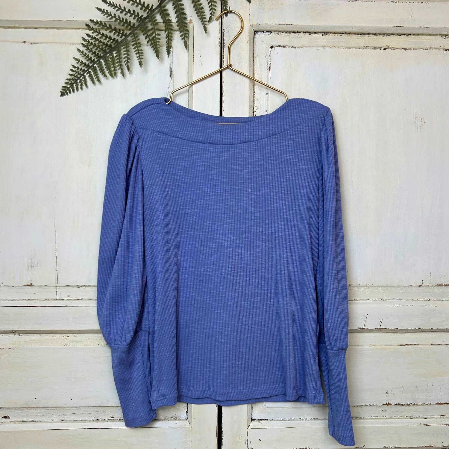 Deze blauwe trui heeft een ribbel structuur, pofmouwen aan de schouders en een boordje onderaan de mouwen. De trui is super leuk te dragen op een jeans. Het is een sportieve hippe trui en heerlijk draagbaar.