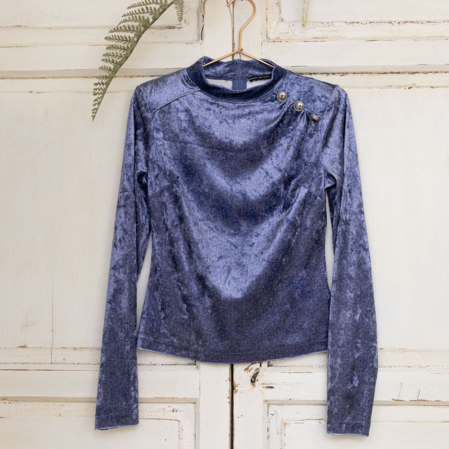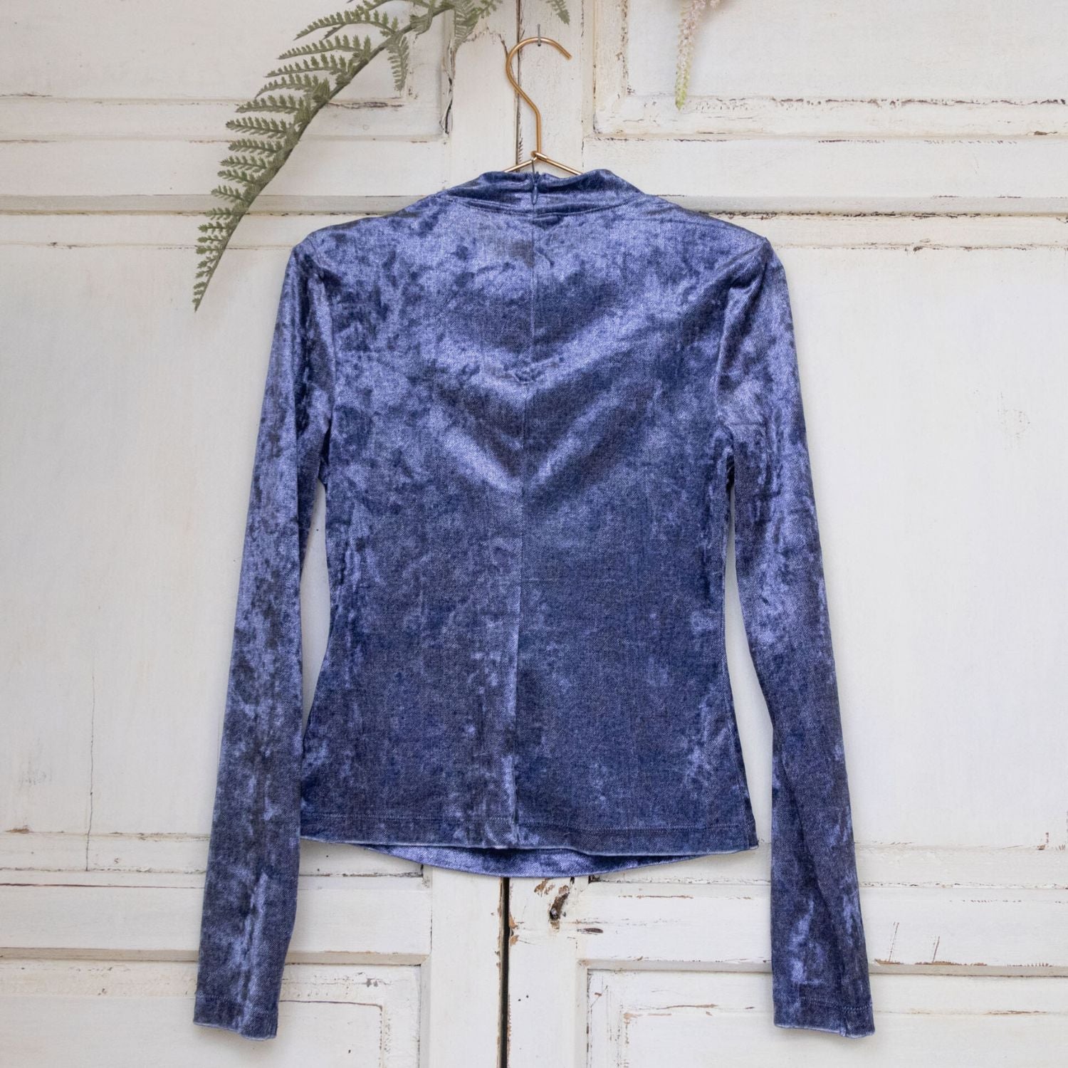 Een prachtige top met lange mouwen en opstaand boordje. De top heeft een fluweel uitstraling met aan de achterkant een ritsje en zilveren knopen aan de linker voorkant.